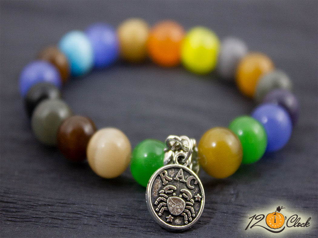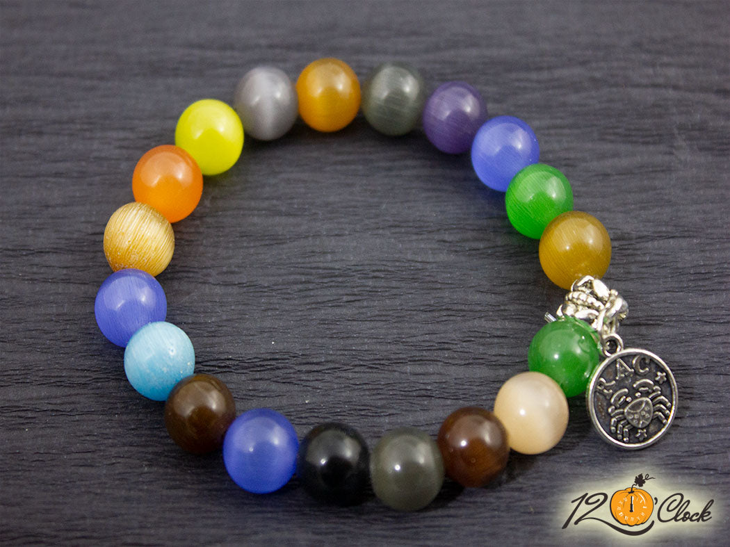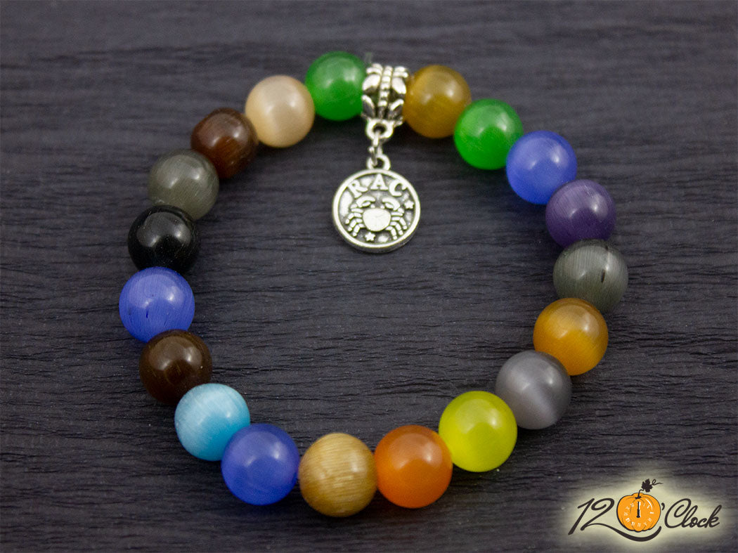 Ръчно изработена гривна с еластична корда, метална халка със зодиакална висулка и котешко око 10мм.