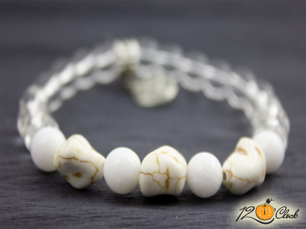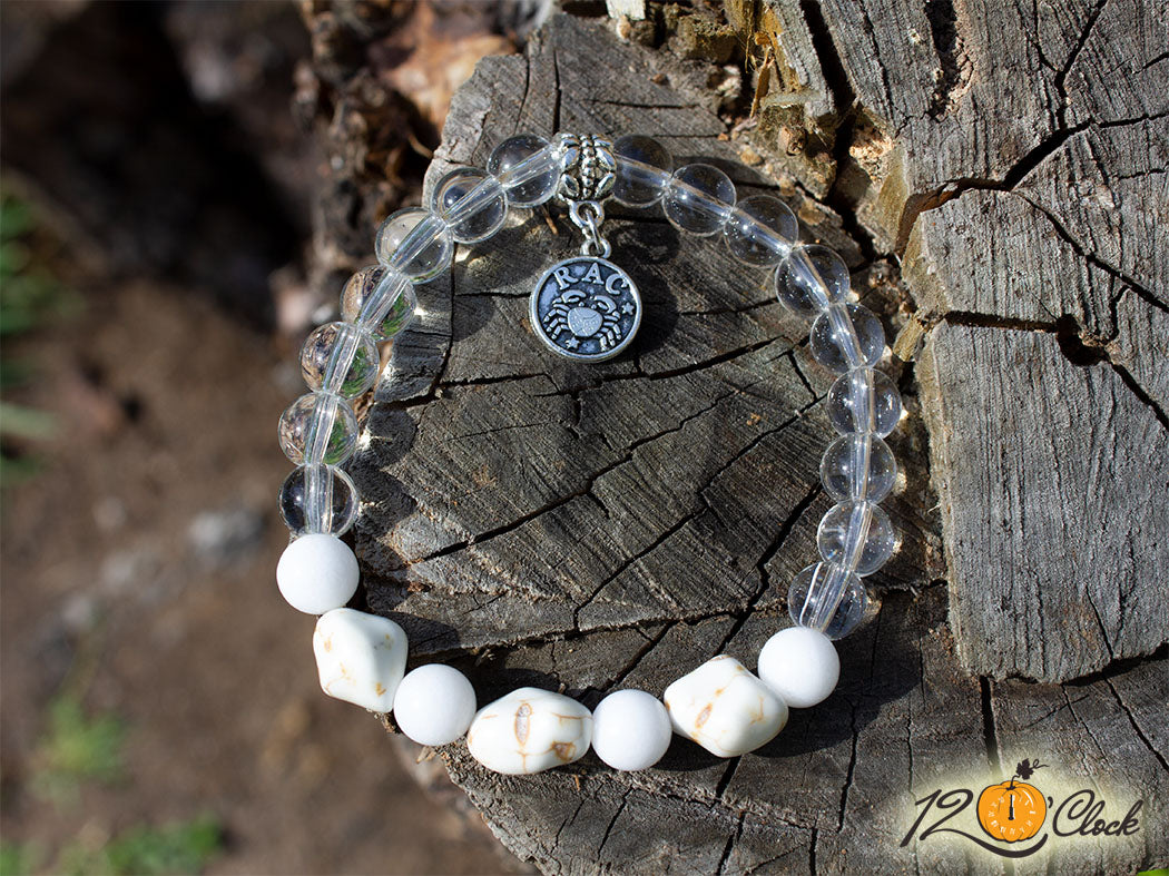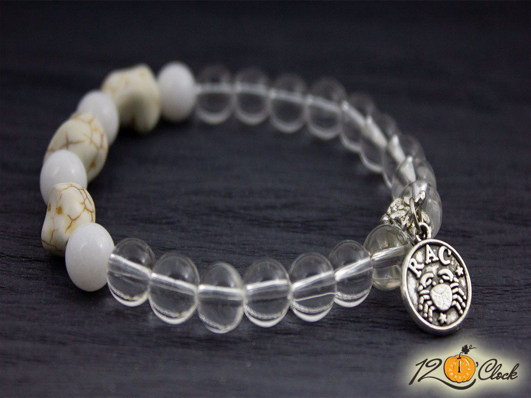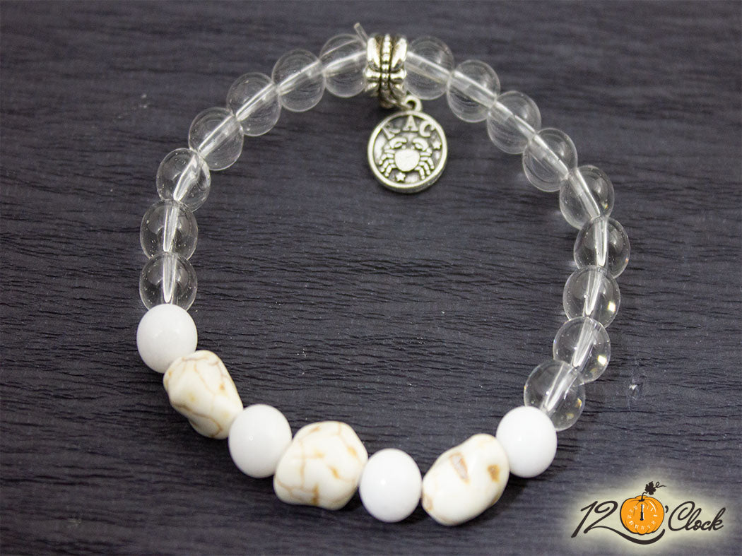 Ръчно изработена гривна с еластична корда, сребриста висулка със зодия и халка, в комбинация от асиметричен бял тюркоаз, седеф 8мм и планински кристал 8мм.