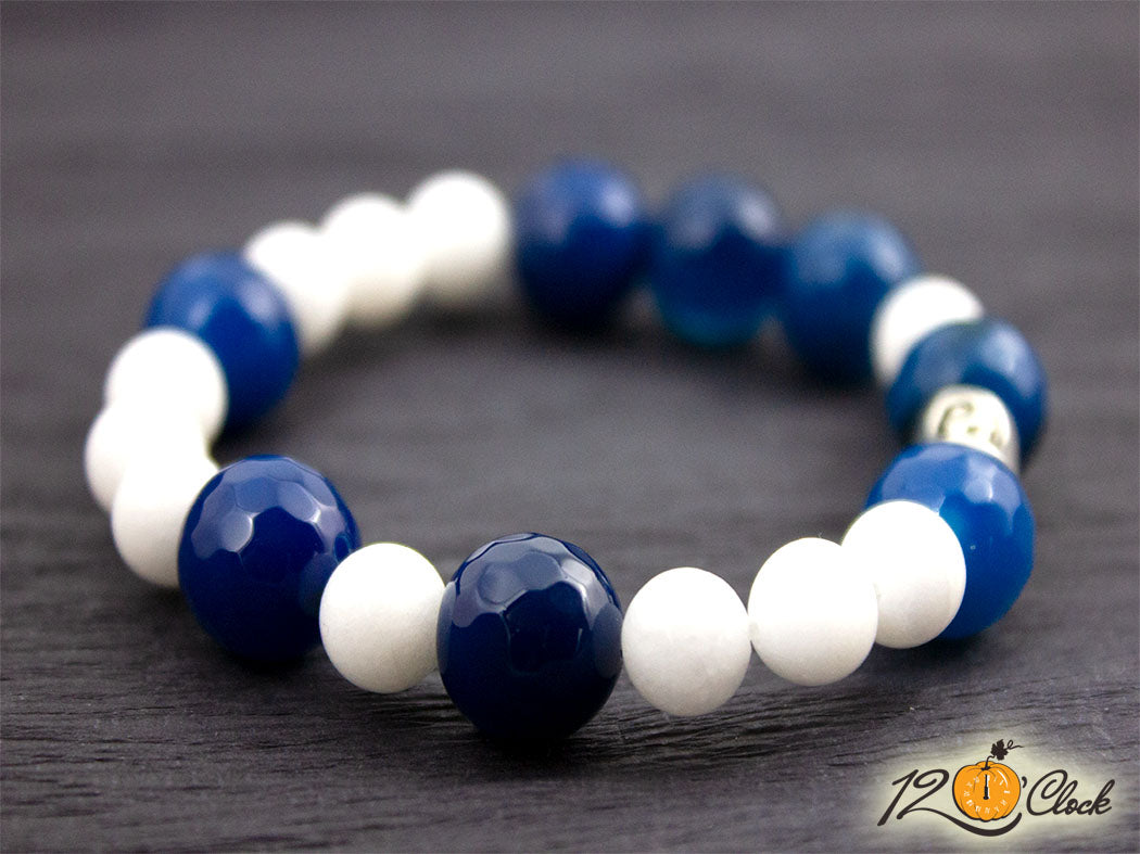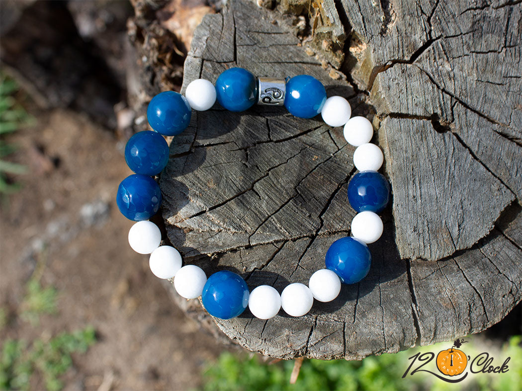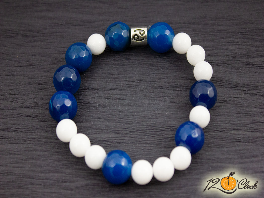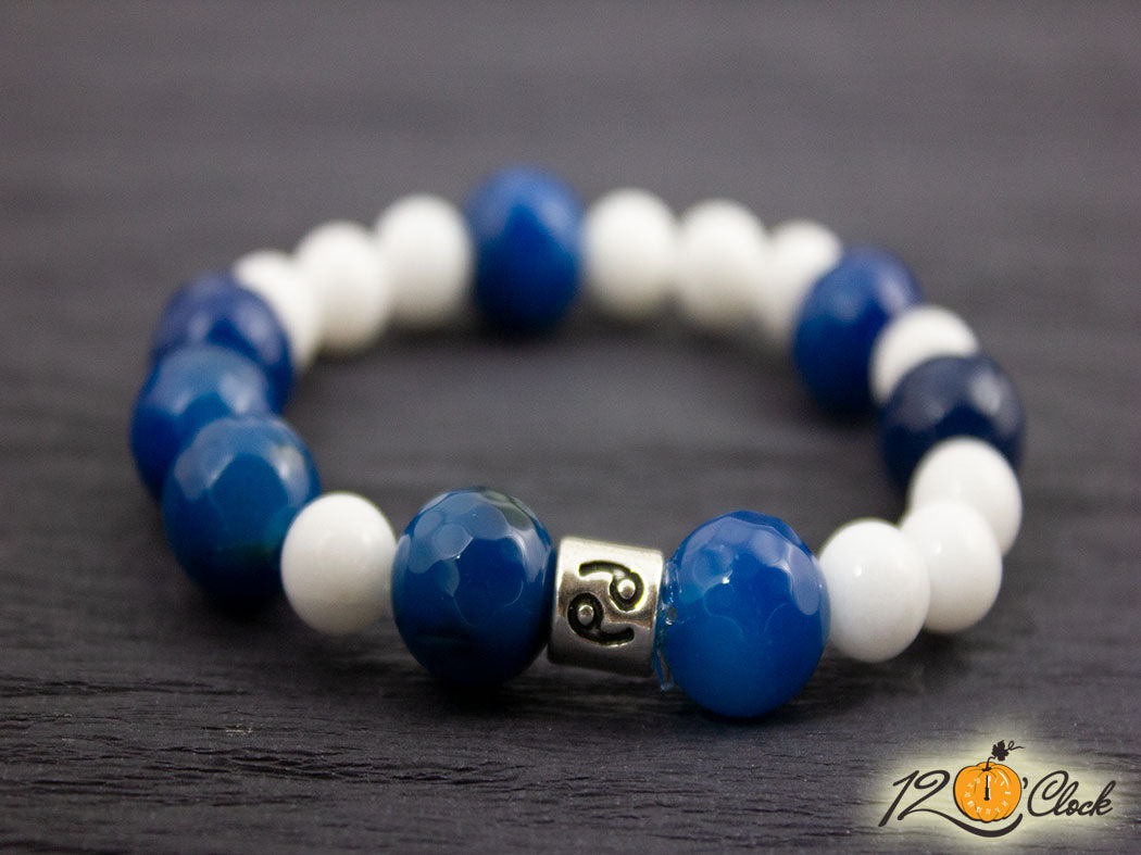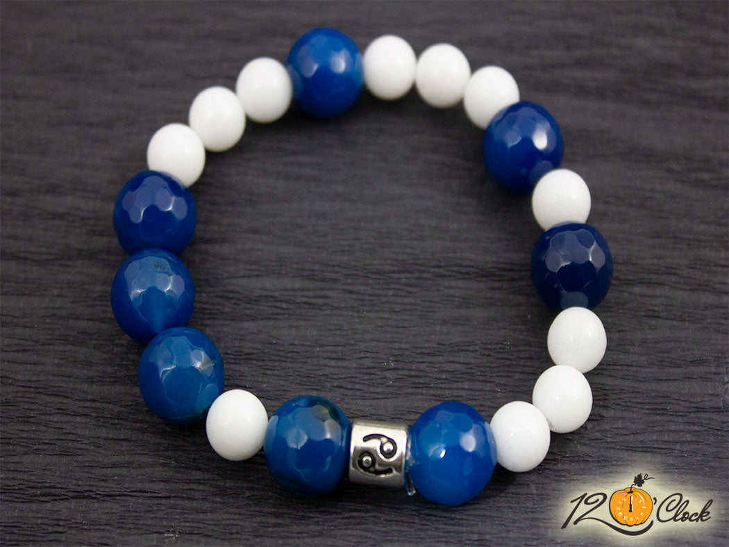 Ръчно изработена гривна с еластична корда, халка със зодия, син фасетиран ахат 12мм и бял ахат 8мм.