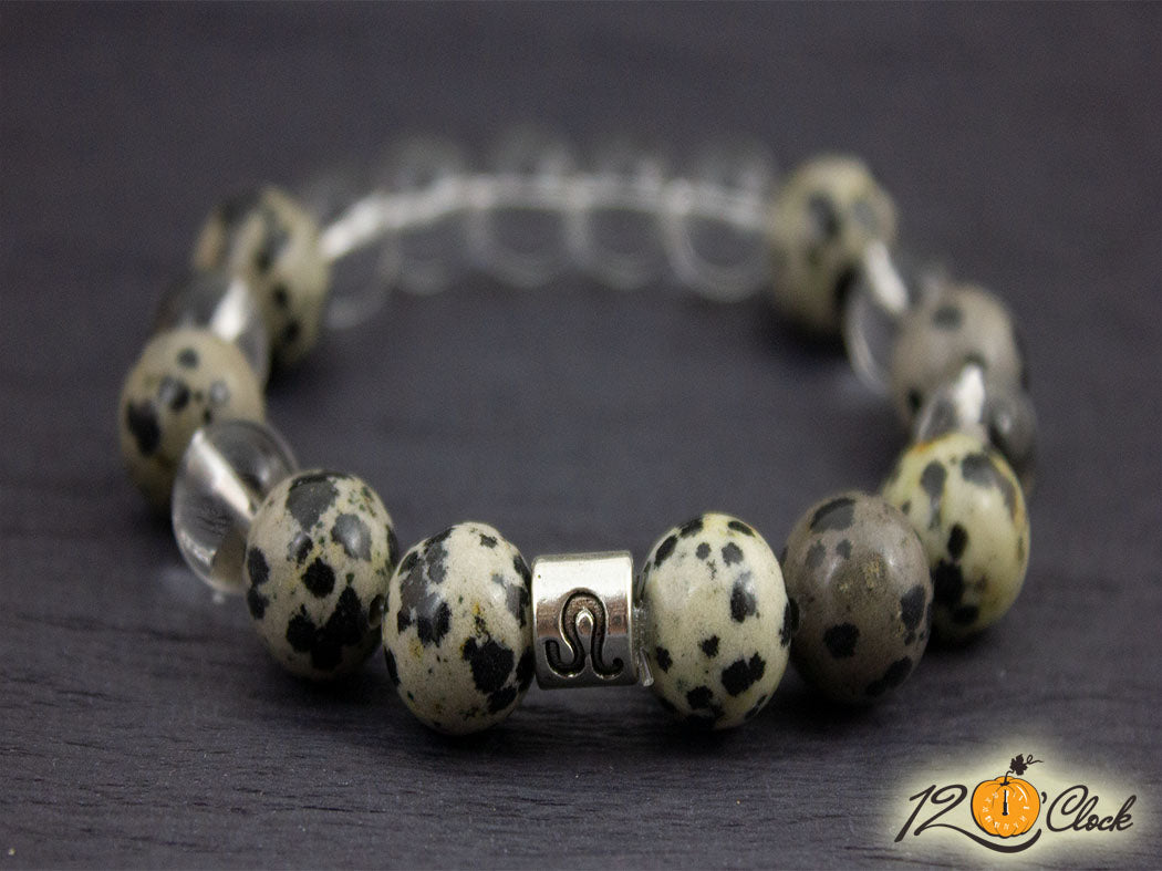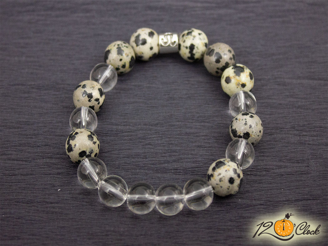 Ръчно изработена гривна от еластична корда, зодиакален пръстен, далматински яспис 12мм и планински кристал 10мм.
