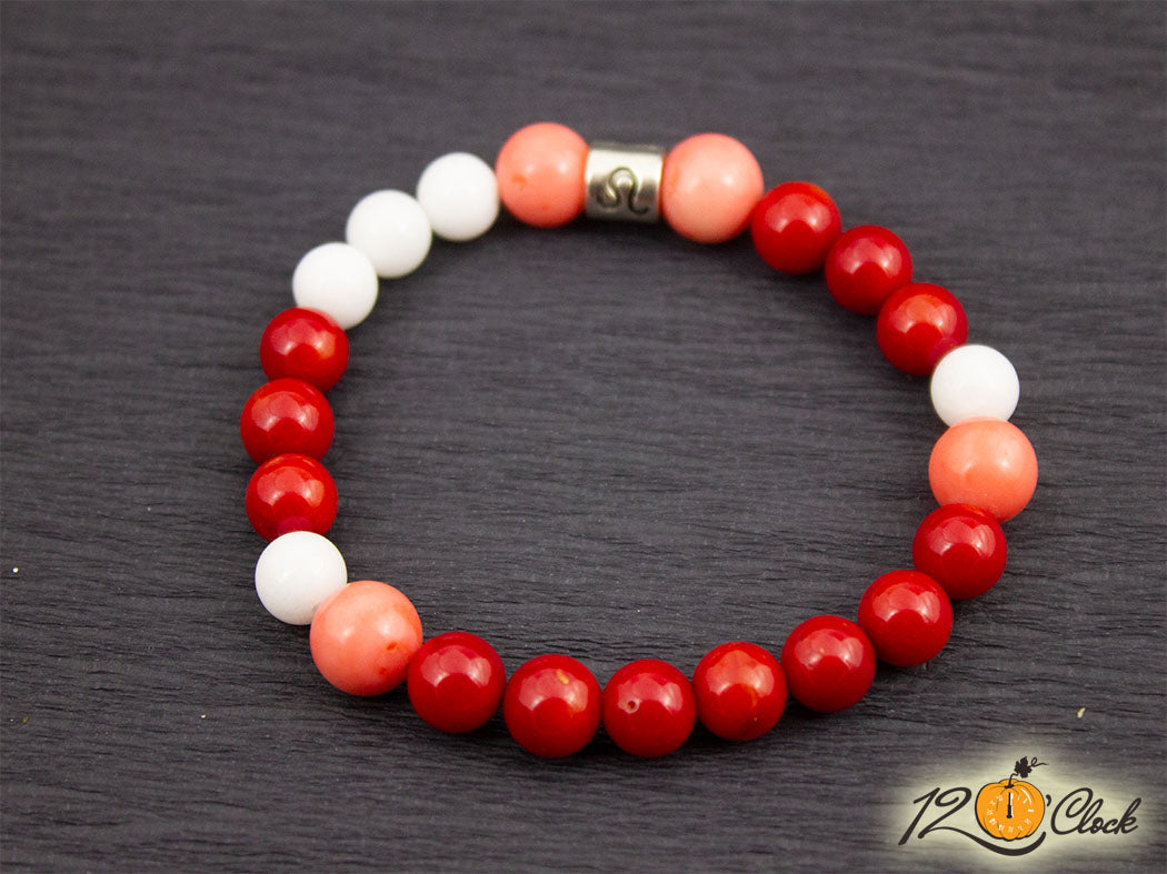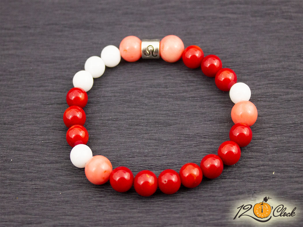 Ръчно изработена гривна с еластична корда, зодиакален пръстен, червен корал 8мм, розов корал 10мм и седеф 8мм.