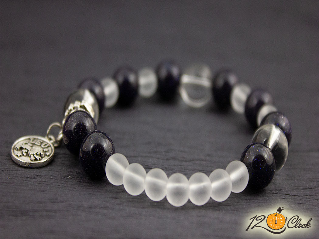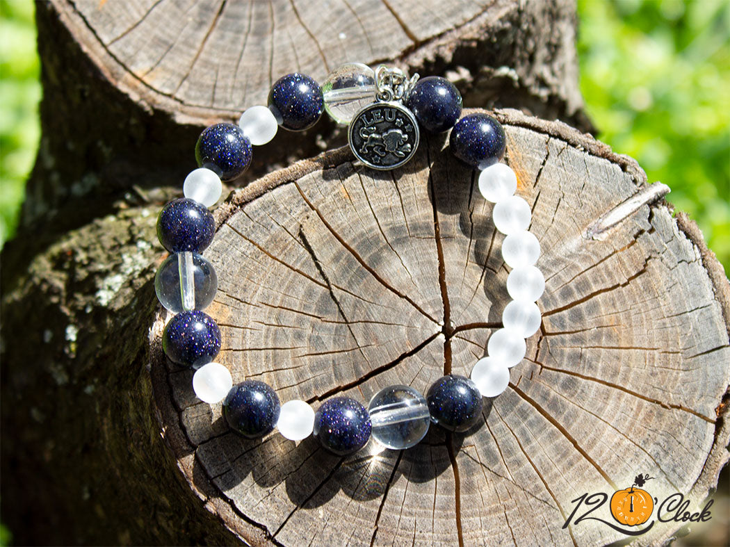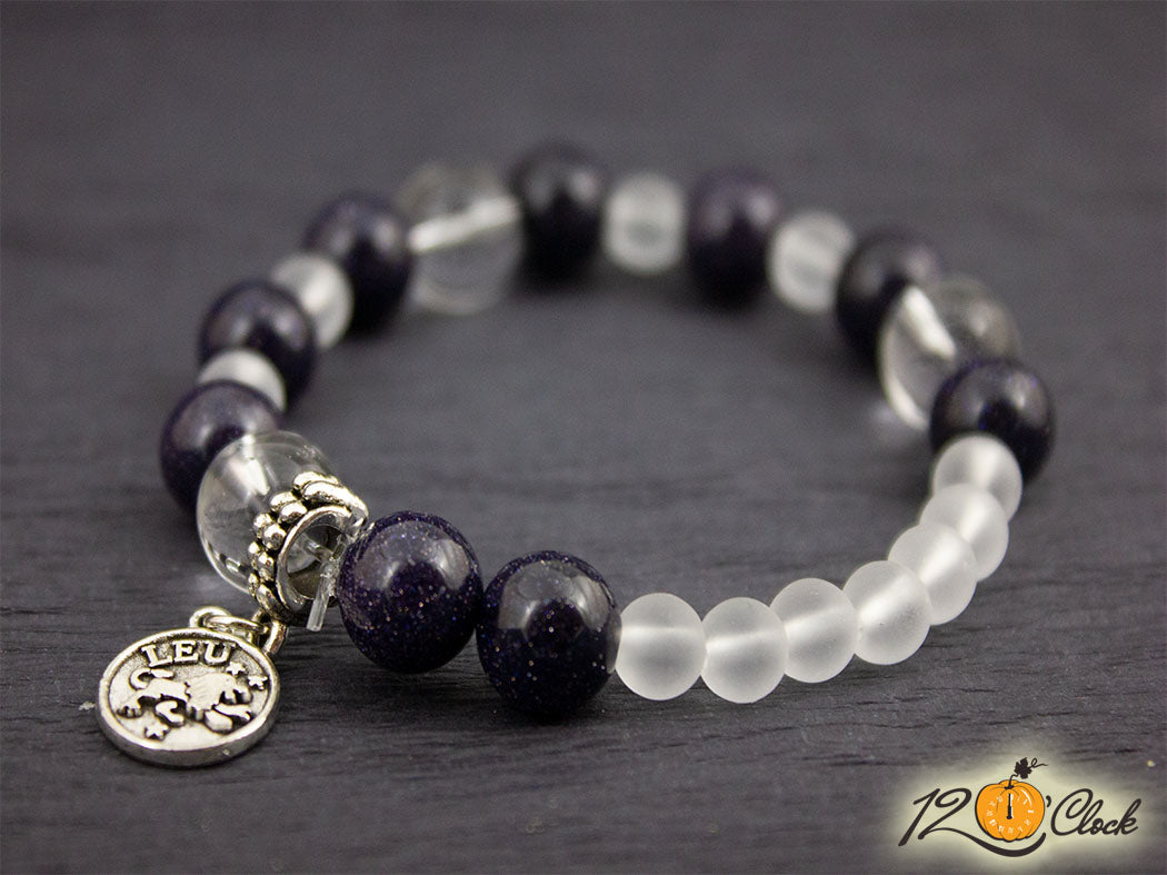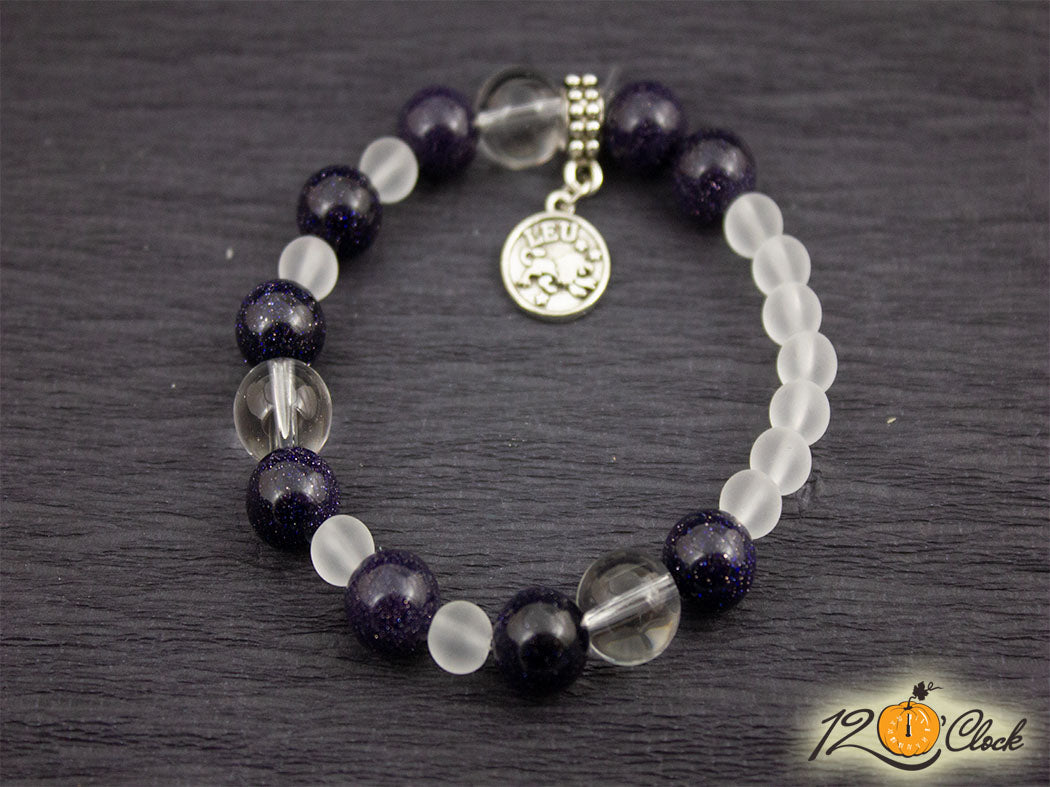 Ръчно изработена гривна с еластична корда, сребриста халка със зодиакална висулка в съчетание от слънчев камък 10мм, планински кристал 10мм и планински кристал мат 6мм.
