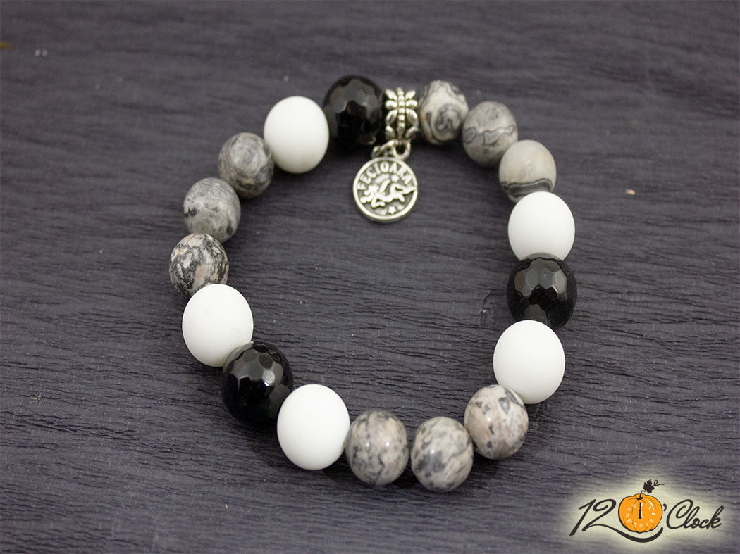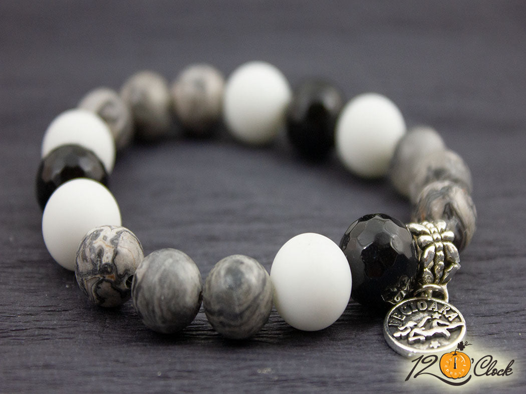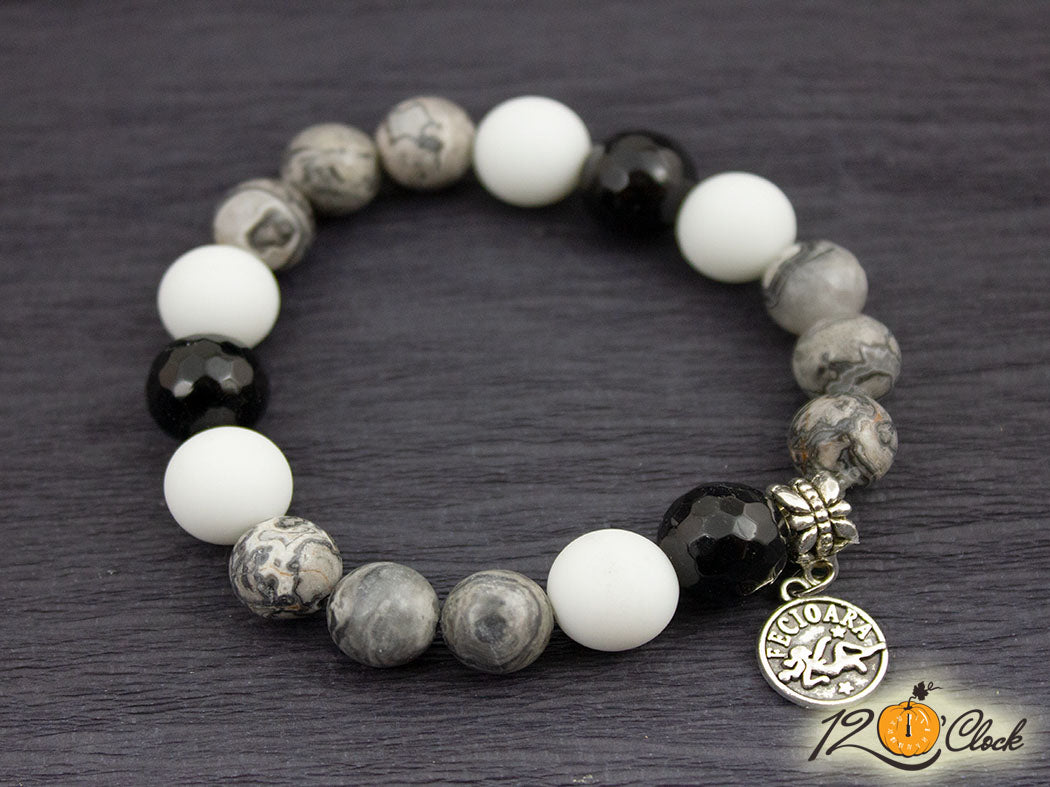Ръчно изработена гривна от еластична корда, зодиакална висулка, яспис зебра 10мм,фасетиран оникс 12мм и бял ахат мат 12мм.