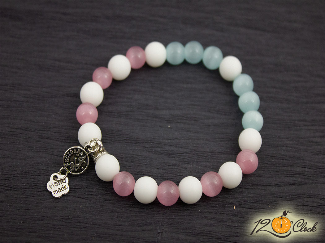 Гривна "Бял ахат мат, светло синьо и розово котешко око" - зодия Дева