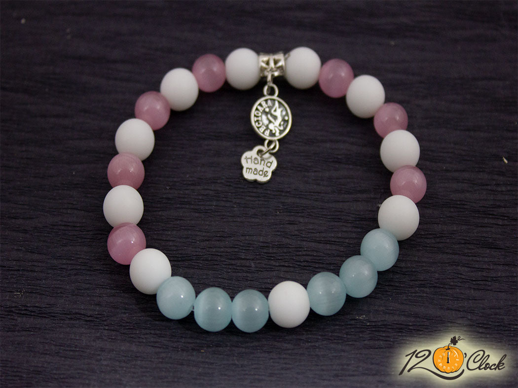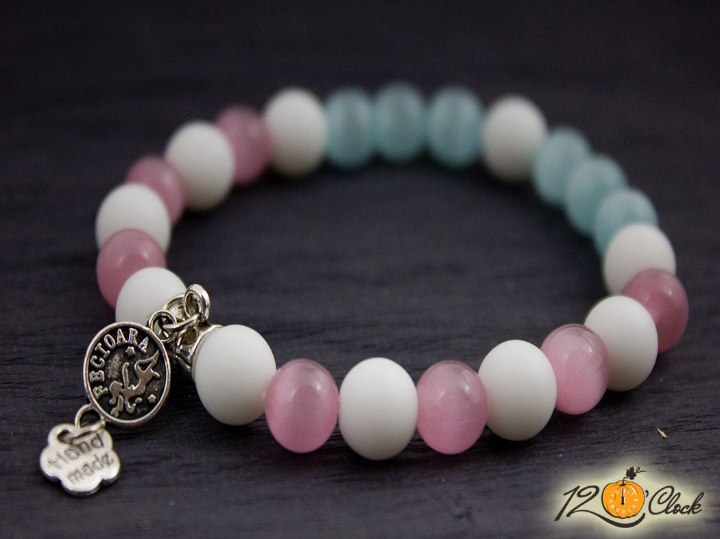 Ръчно изработена гривна от еластична корда, сребриста висулка със зодия и нежна комбинация от бял ахат мат 8мм, светло синьо котешко око 8мм и розово котешко око 8мм.