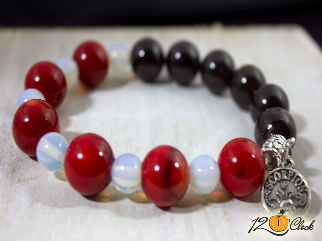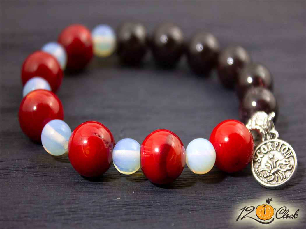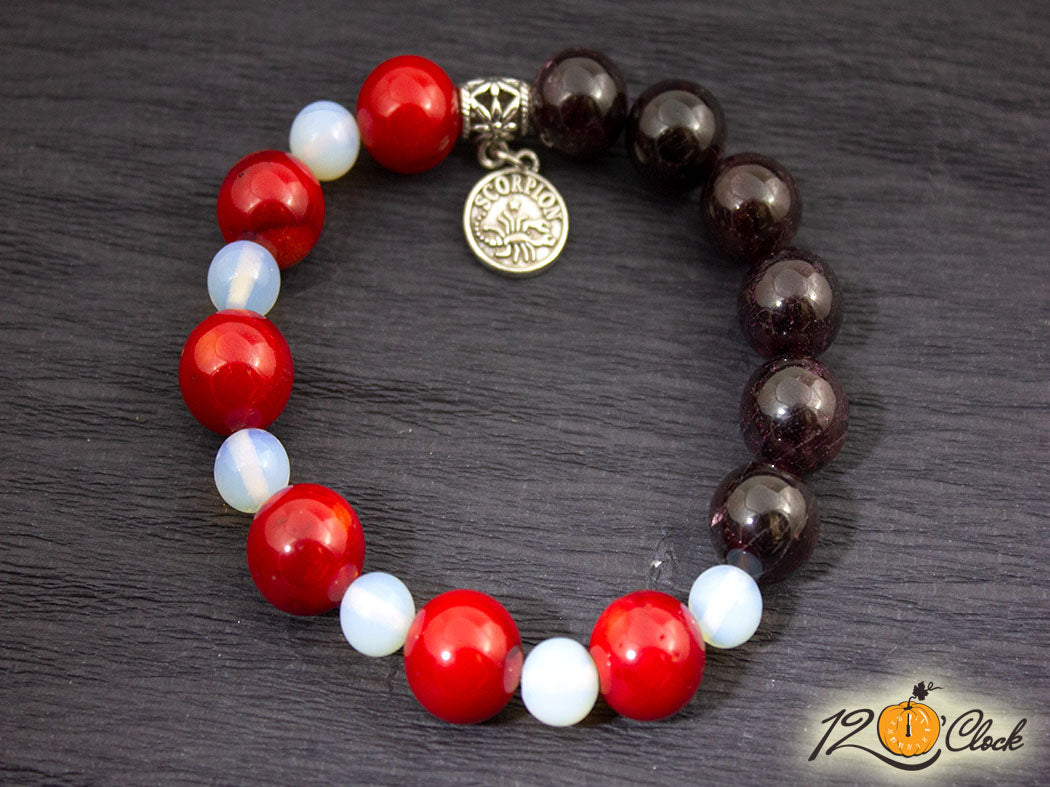 Ръчно изработена гривна от еластична корда, красив разделител със зодиакална висулка,в съчетание от гранат 12мм, червен корал 12мм и лунен камък 8мм.