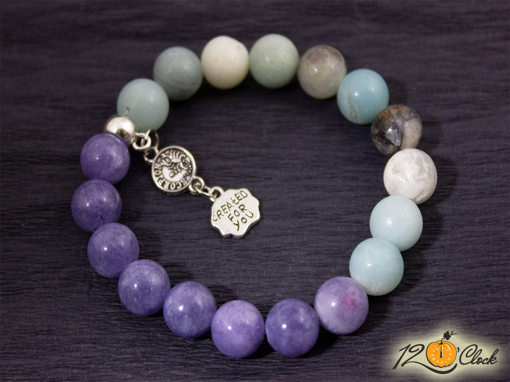 Ръчно изработена гривна с разделител с висулка и цвете,еластична корда и комбинация от амазонит 10мм и аквамарин 10мм.