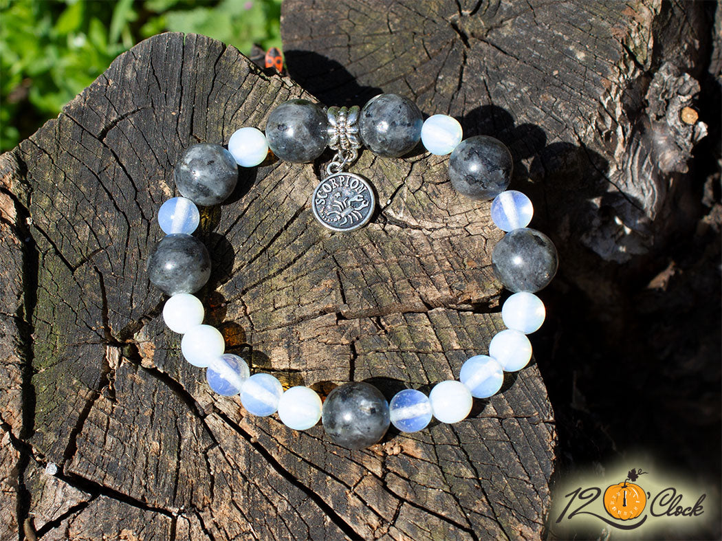 Ръчно изработена гривна с уникален разделител и зодиакалня висулка, както и съчетание от лабрадорит 12мм и лунен камък 8мм.