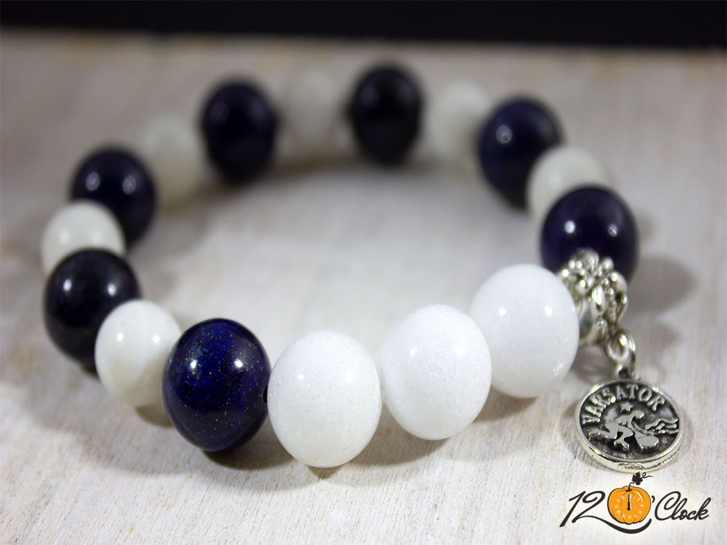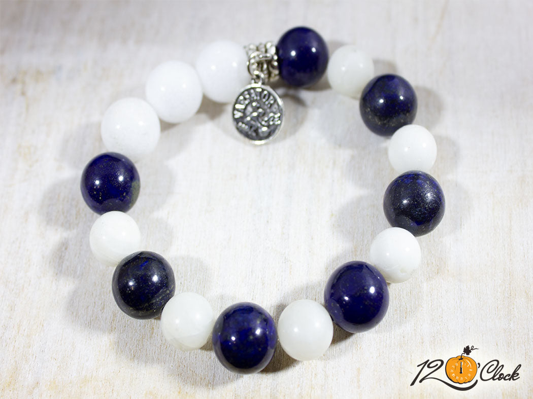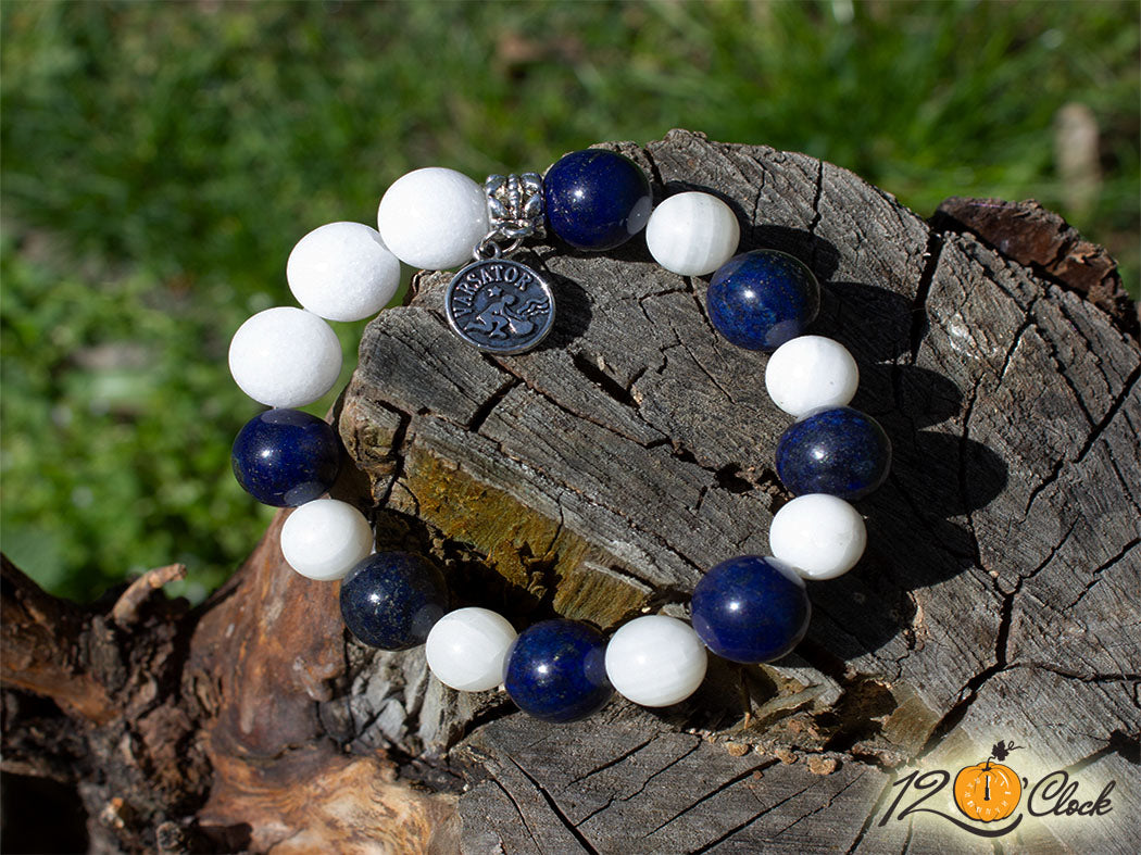 Ръчно изработена гривна с еластична корда, красив разделител със зодиакална висулка, лазурит 12мм и седеф 12мм и седеф 10мм.