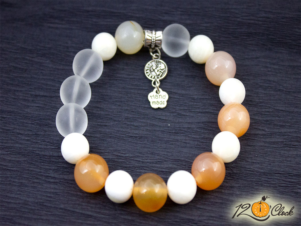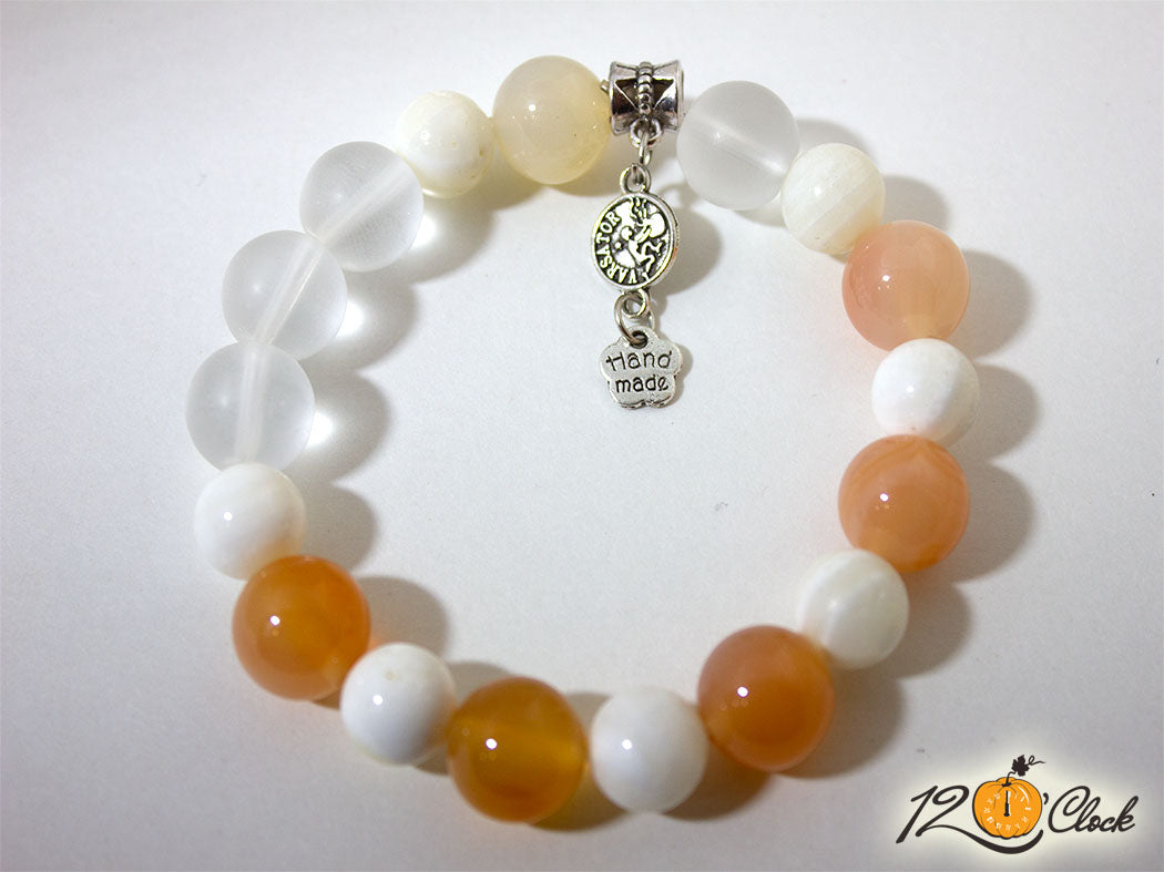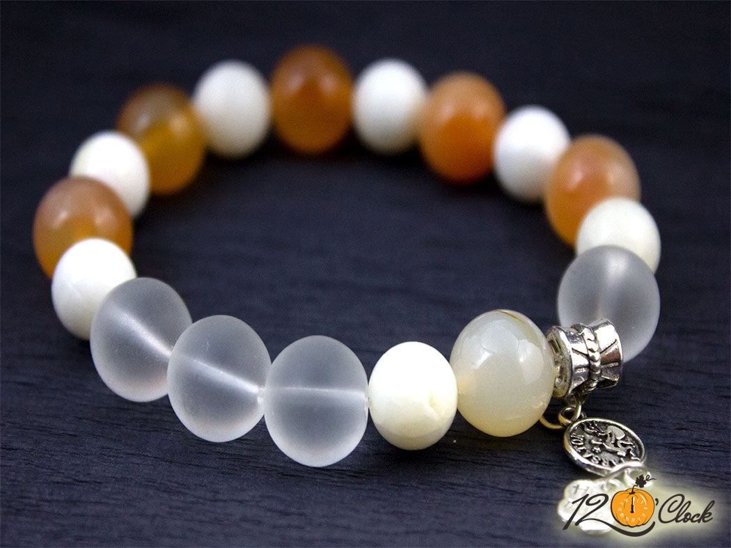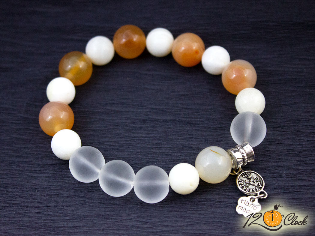 Ръчно изработена гривна с еластична корда, разделител със зодиакална висулка и цвете, в комбинация от млечно оранжев ахат 12мм,планински кристал мат 12мм и седеф 10мм.