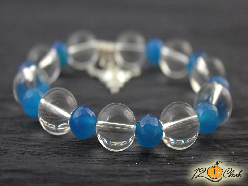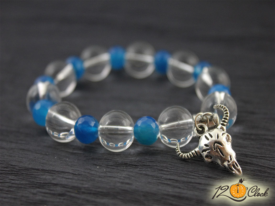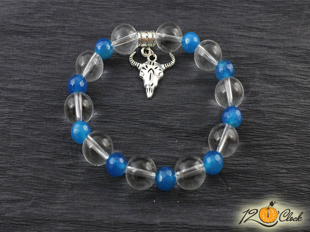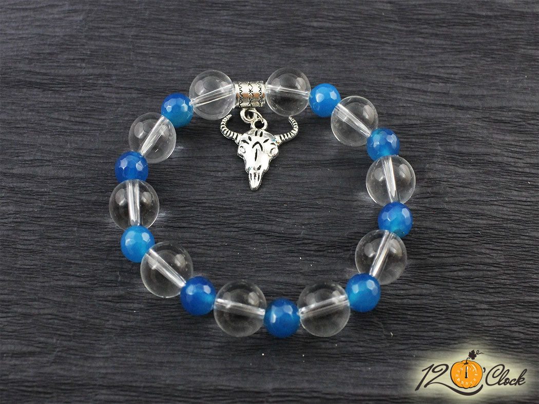 Ръчно изработена гривна с основа еластична корда и камъни от планински кристал 12мм и фасетиран тъмно син ахат 8 мм. Към камъните има висулка бик.
