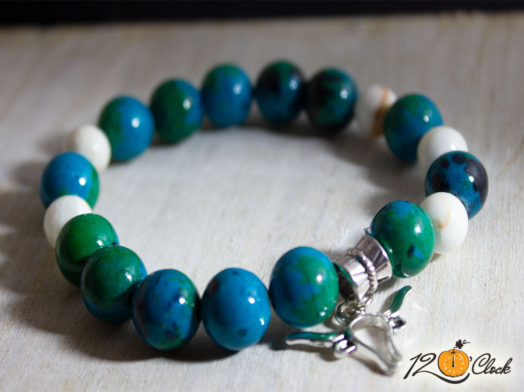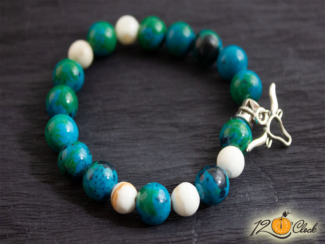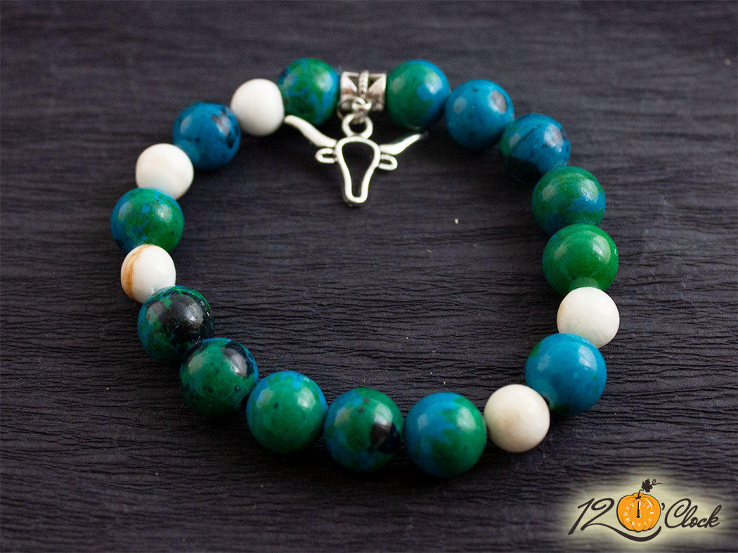 Ръчно изработена гривна с основа еластична корда и камъни от зелена хризокола 10мм и бял жадеит с кафяви ивици 8мм. Към камъните има висулка бик.