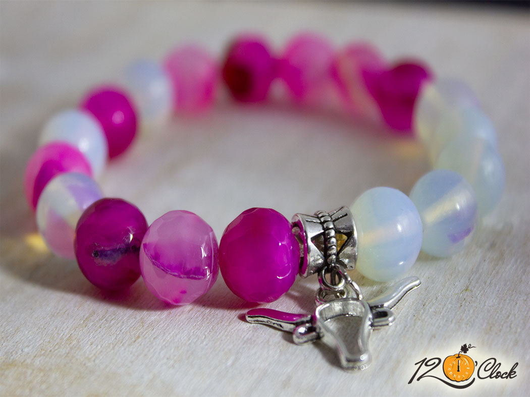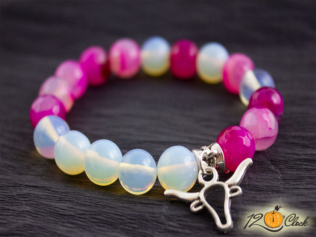 Ръчно изработена гривна с основа еластична корда и камъни от лунен камък 10мм и фасетиран ивчест ахат 10мм. Към камъните има висулка бик.