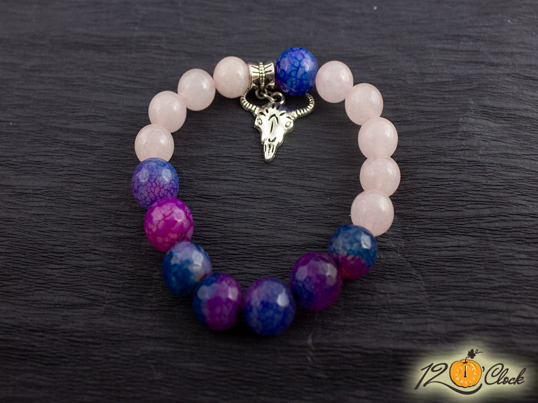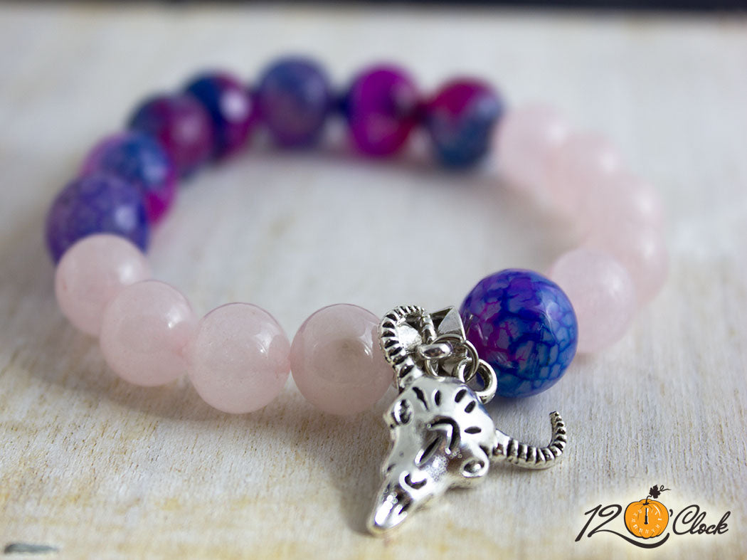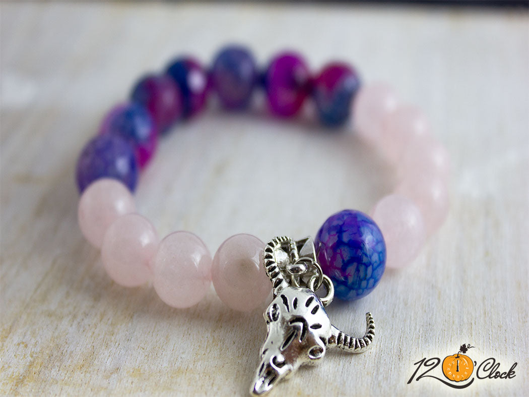 Ръчно изработена гривна с основа еластична корда и камъни от синьо розов лилав драконов ахат 12мм и розов кварц 10мм.Към камъните има висулка бик.