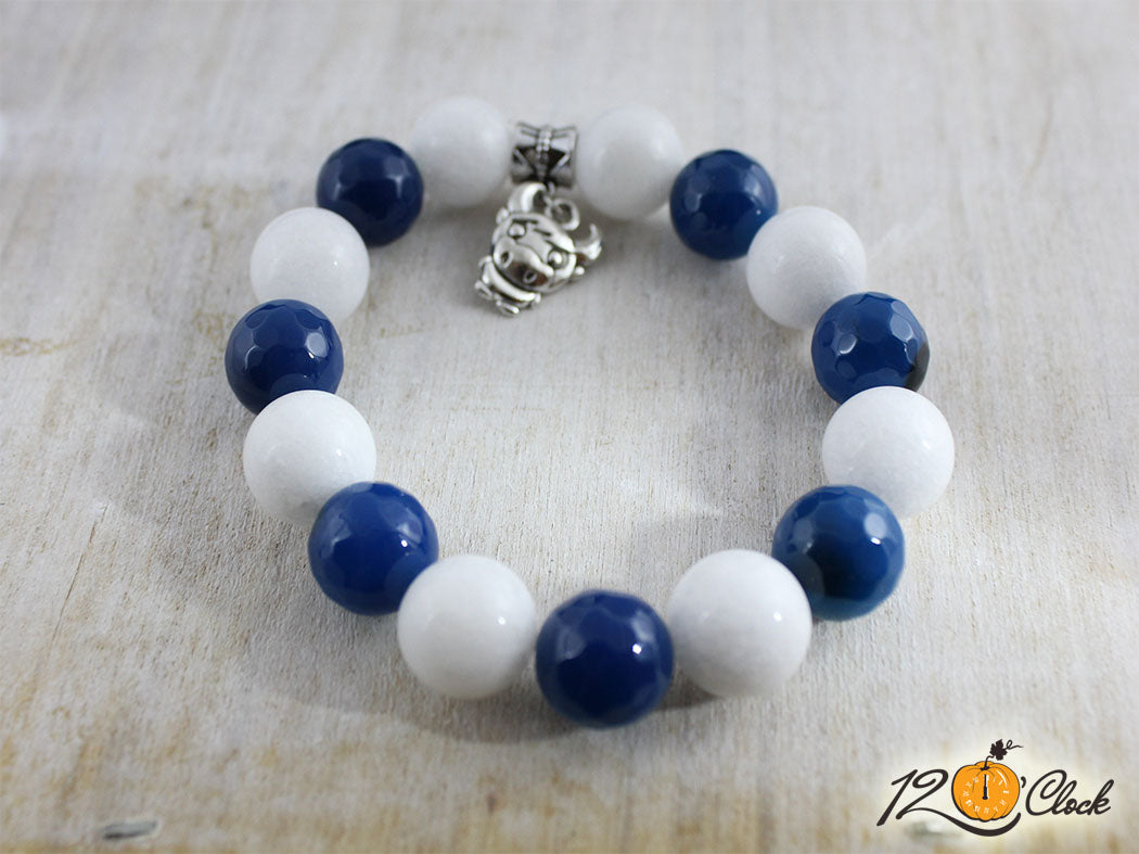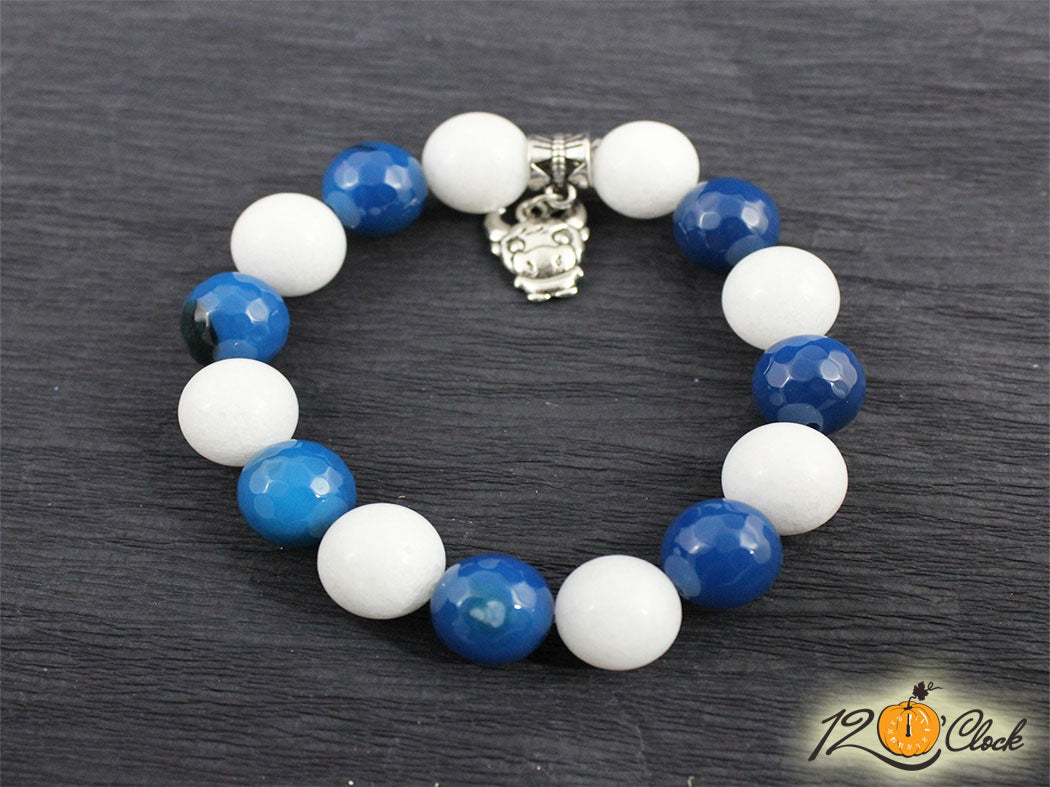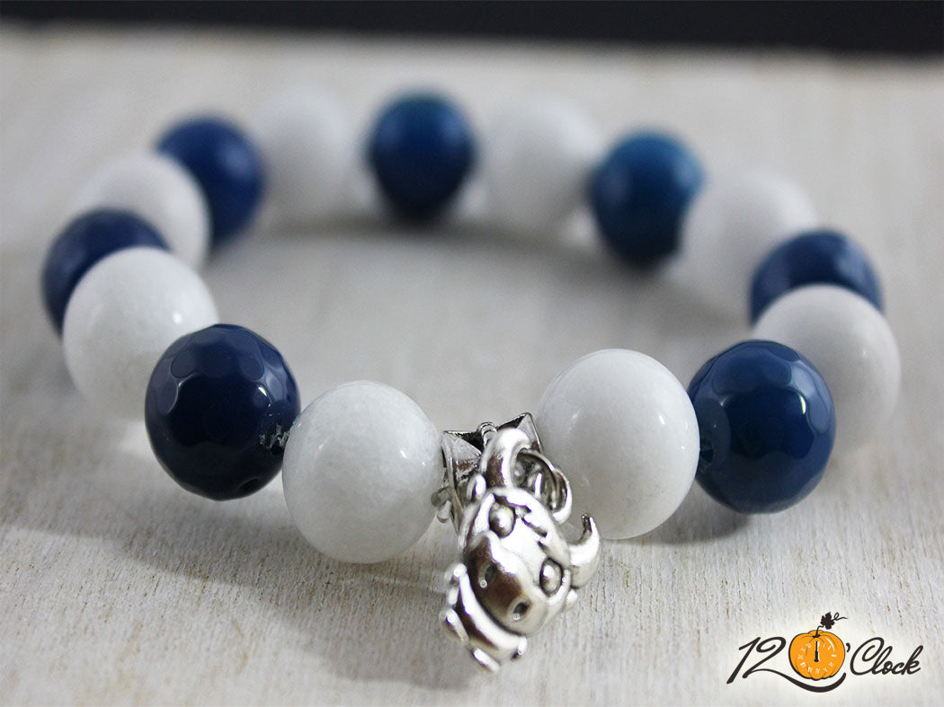 Ръчно изработена гривна с основа еластична корда и камъни от бял кварц 12 мм и тъмно син фасетиран ахат. 12 мм.. Към камъните има добавена висулка с бик.