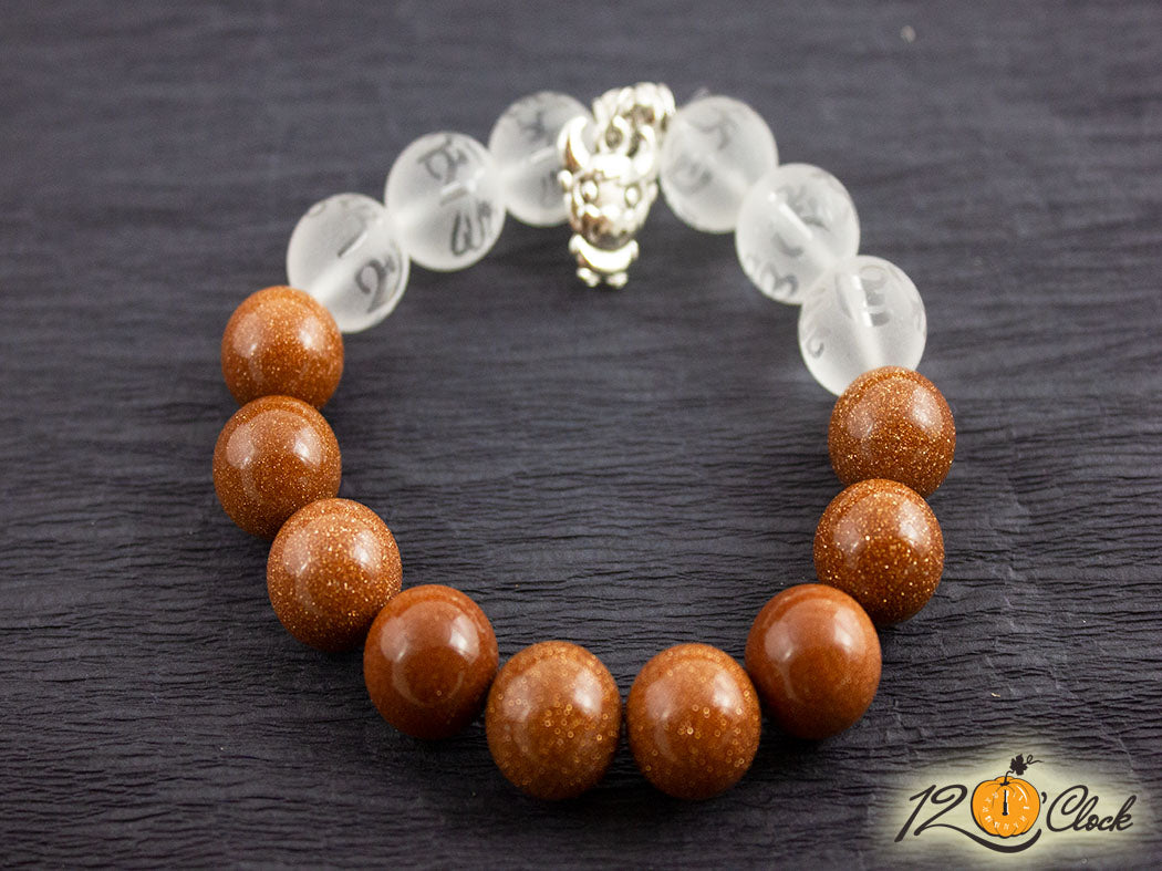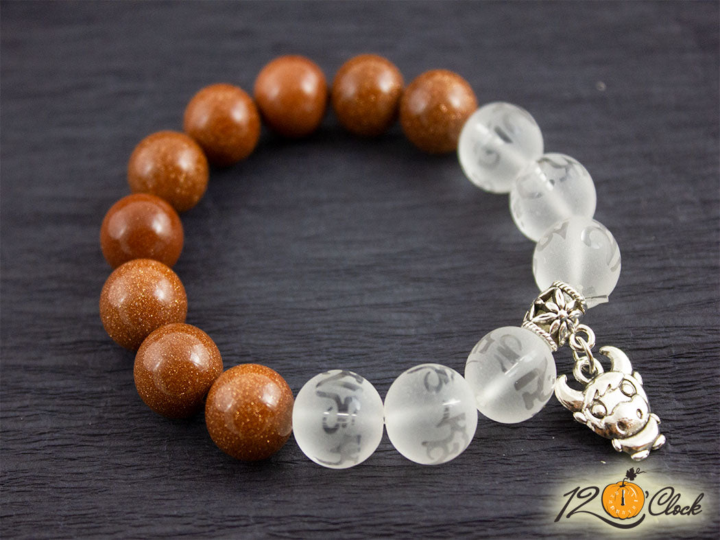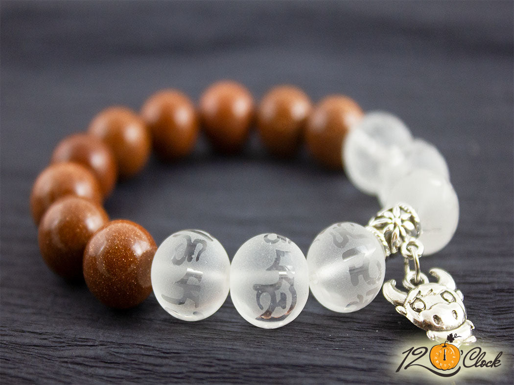 Ръчно изработена гривна с основа еластична корда и камъни от кафяв слънчев камък 12мм и планински кристал с йероглифи 12мм. Към камъните има добавена висулка със символ на бика.