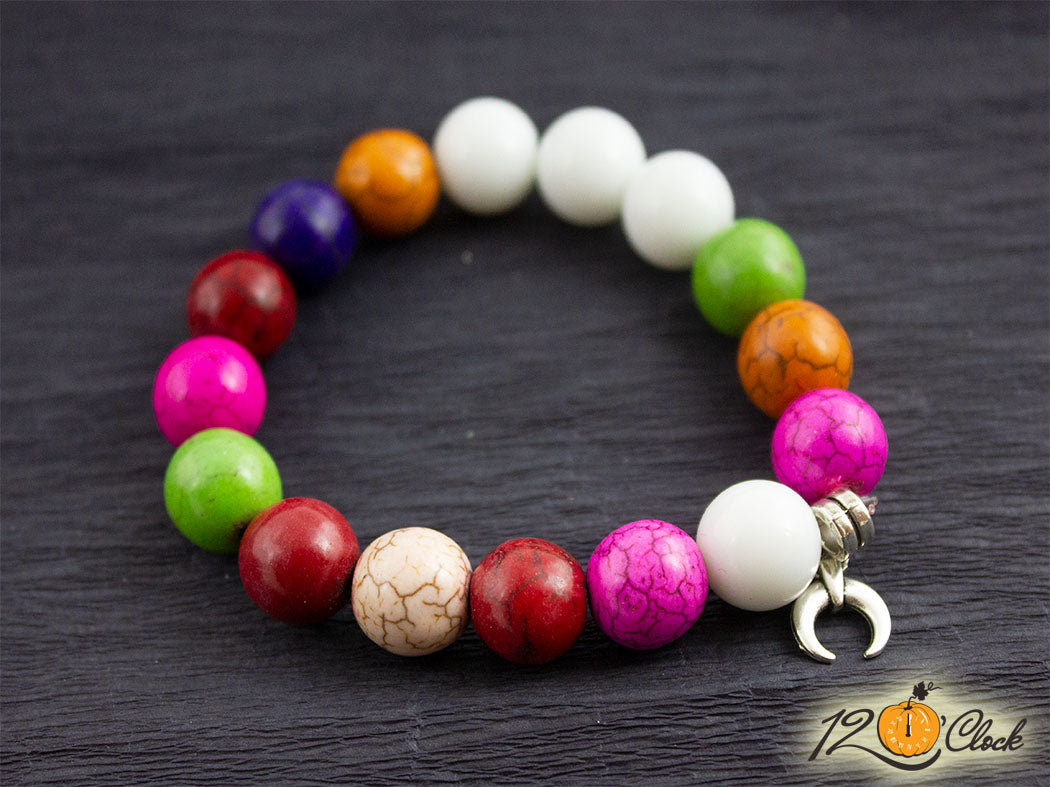 Ръчно изработена гривна с основа еластична корда и камъни от цветен тюркоаз 12мм и бял ахат 12мм. Към камъните има добавена висулка със символ на бика.