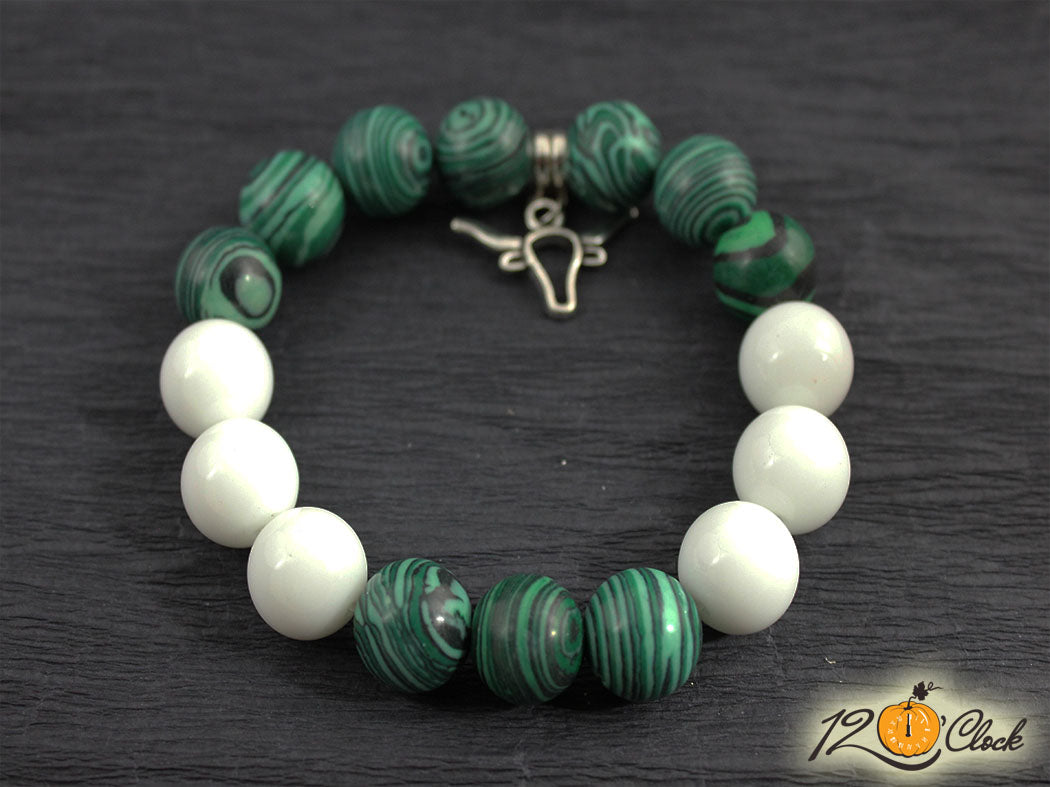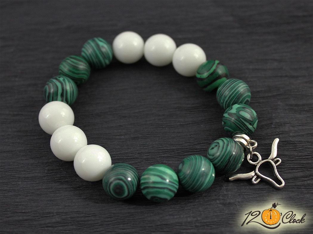 Ръчно изработена гривна с еластична корда и висулка бик, в комбинация от камъни малахит 12мм и бял ахат 12мм.