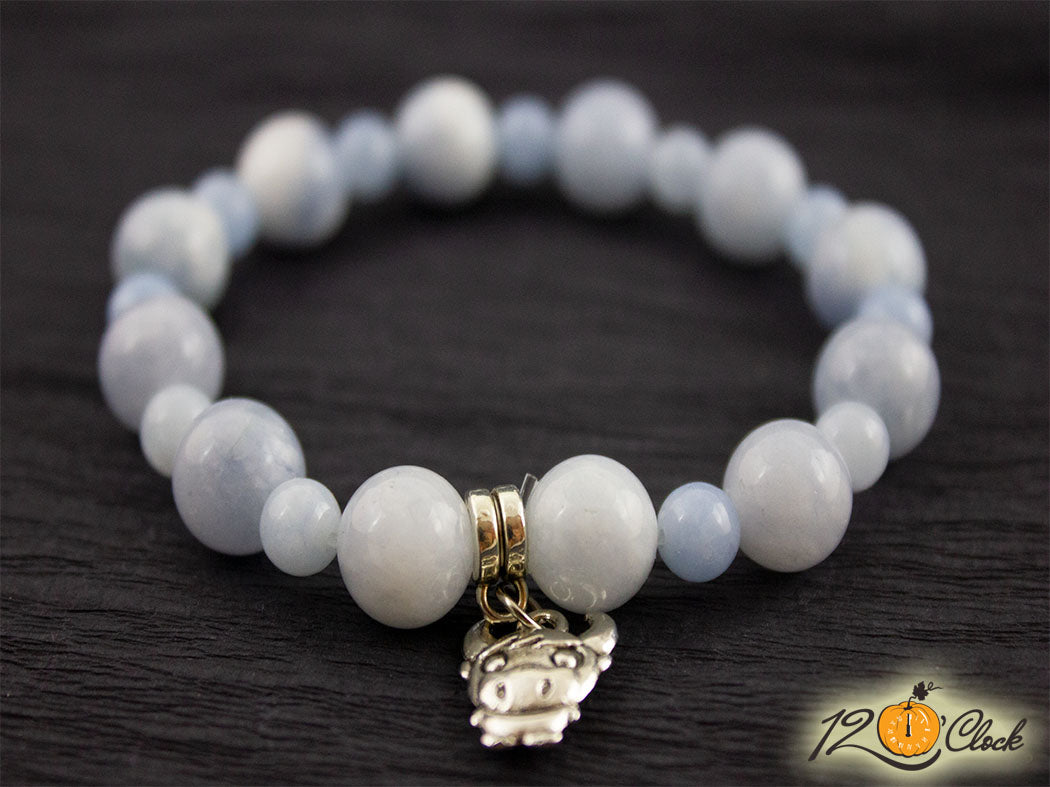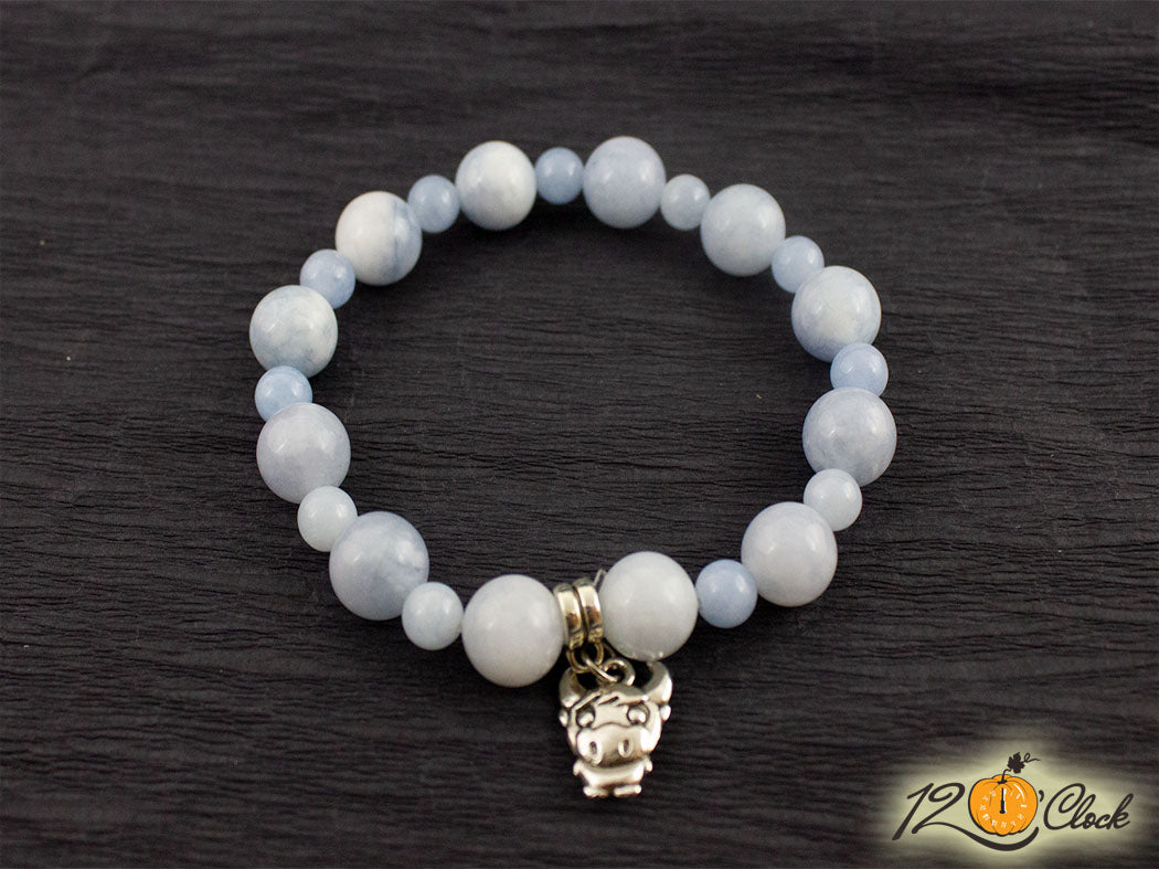 Ръчно изработена гривна с основа еластична корда и камъни от берил 6 мм и 10мм. Към камъните има висулка с бик.