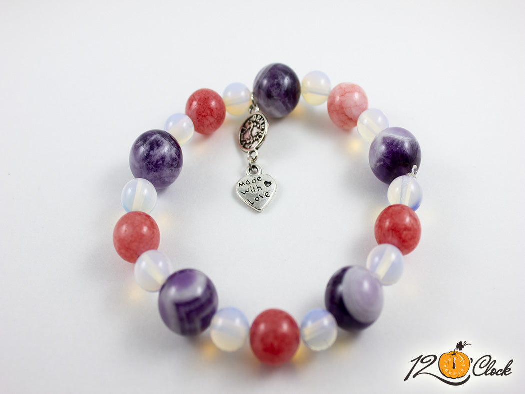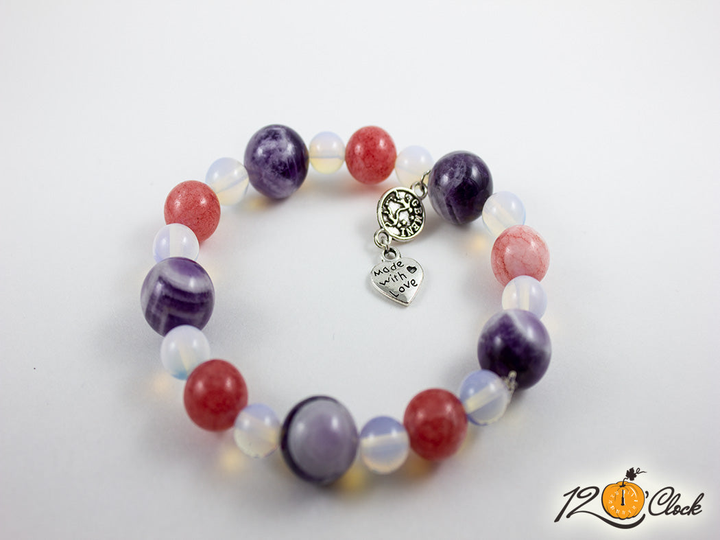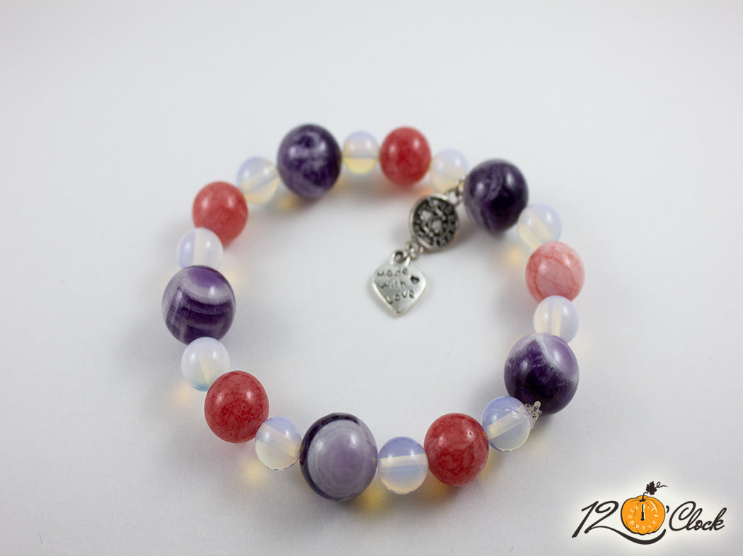 Ръчно изработена гривна от еластична корда, халка, зодия и сърце, в комбинация от аметист 12 мм, ягодов кварц 10 мм и лунен камък 8 мм.