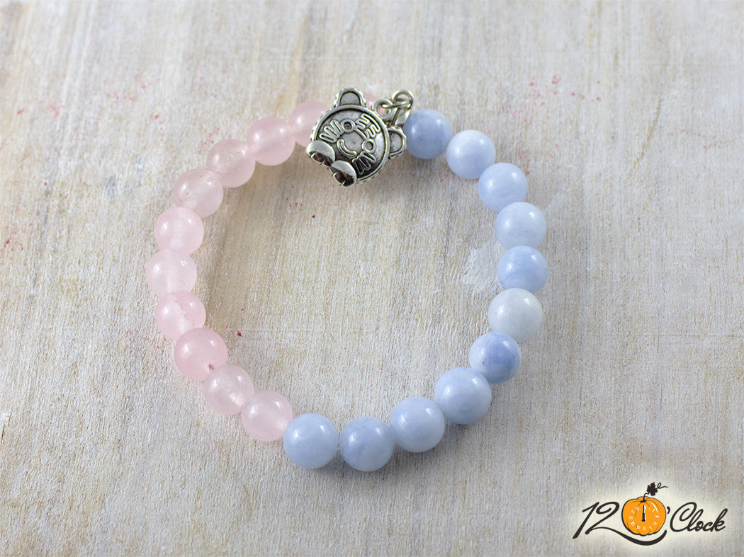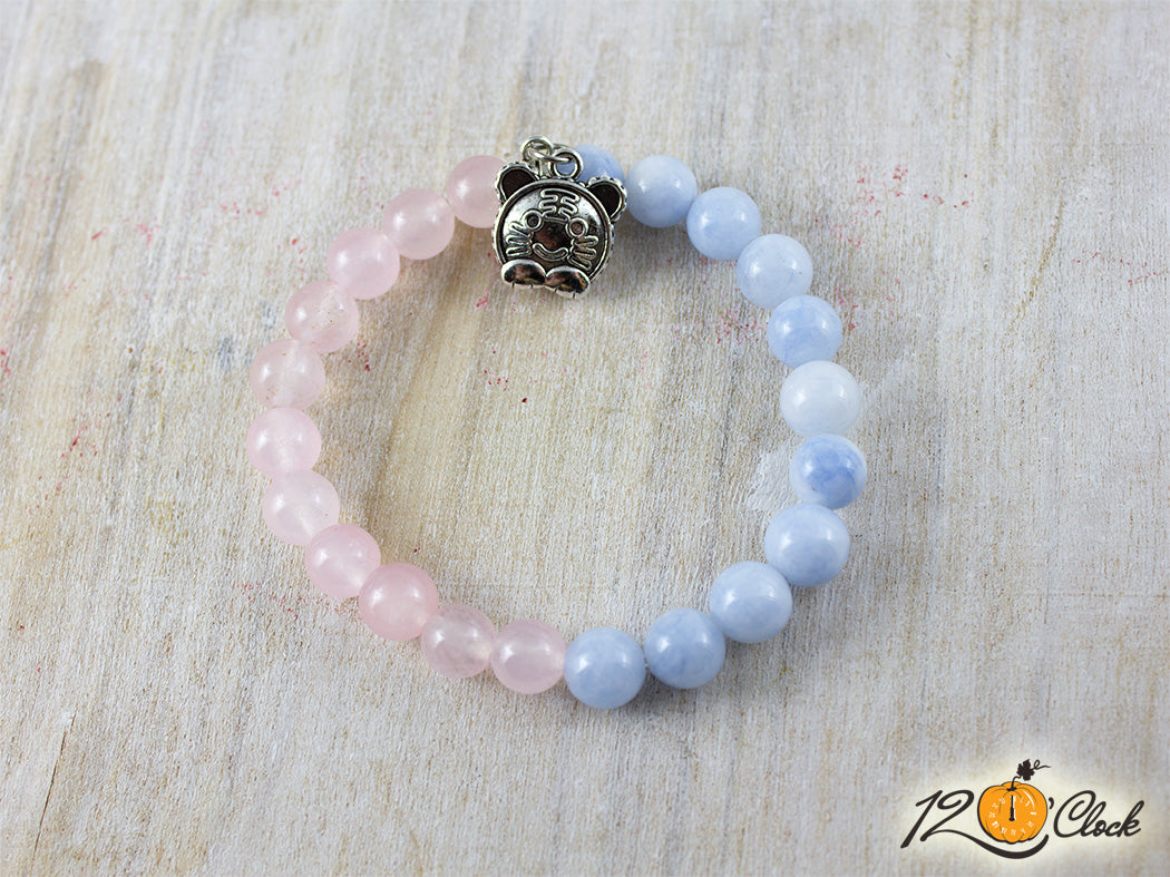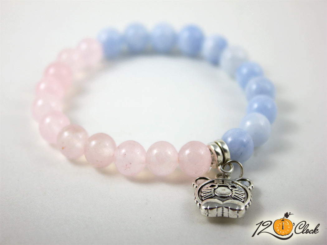 Ръчно изработена гривна с еластична корда, разделител, халка, символ на тигър и и съчетание от камъни розов кварц 8мм и петалит 8мм.