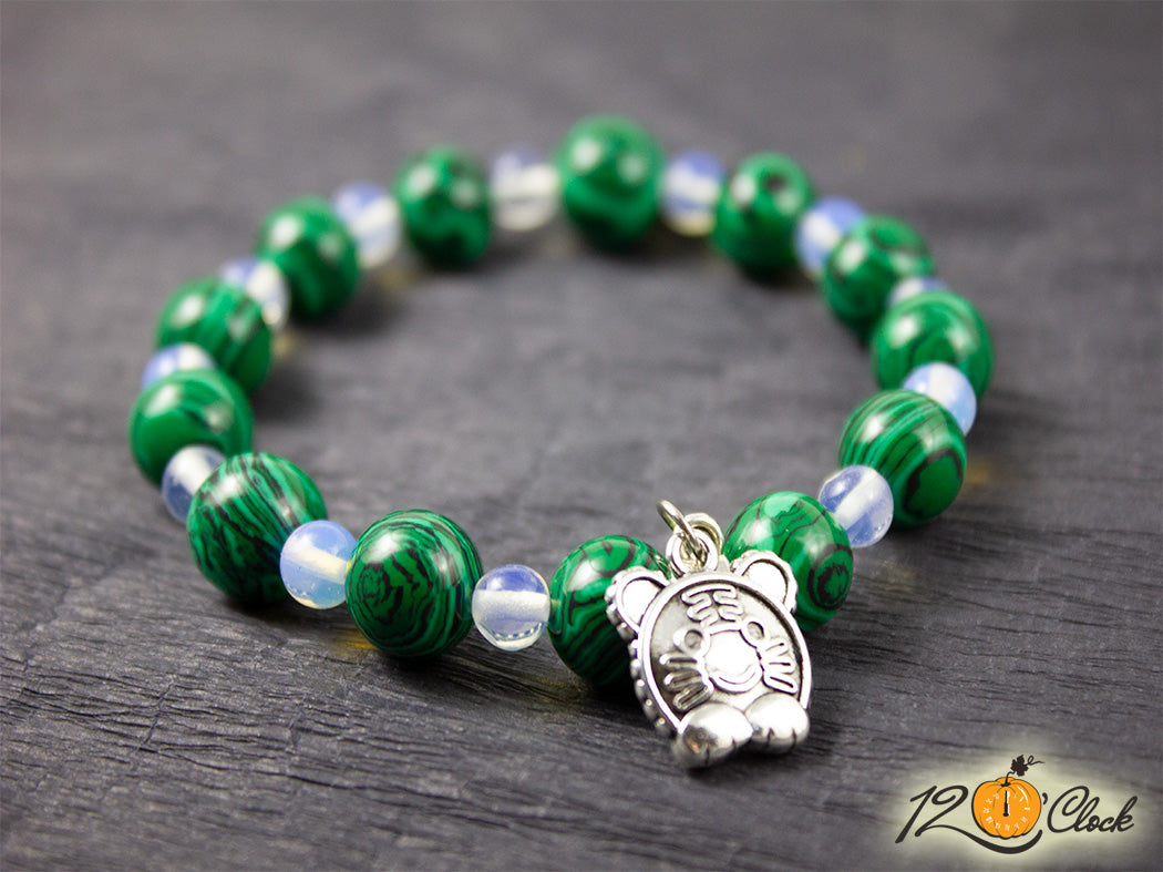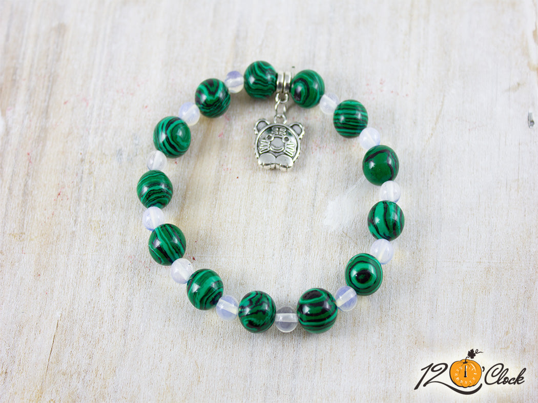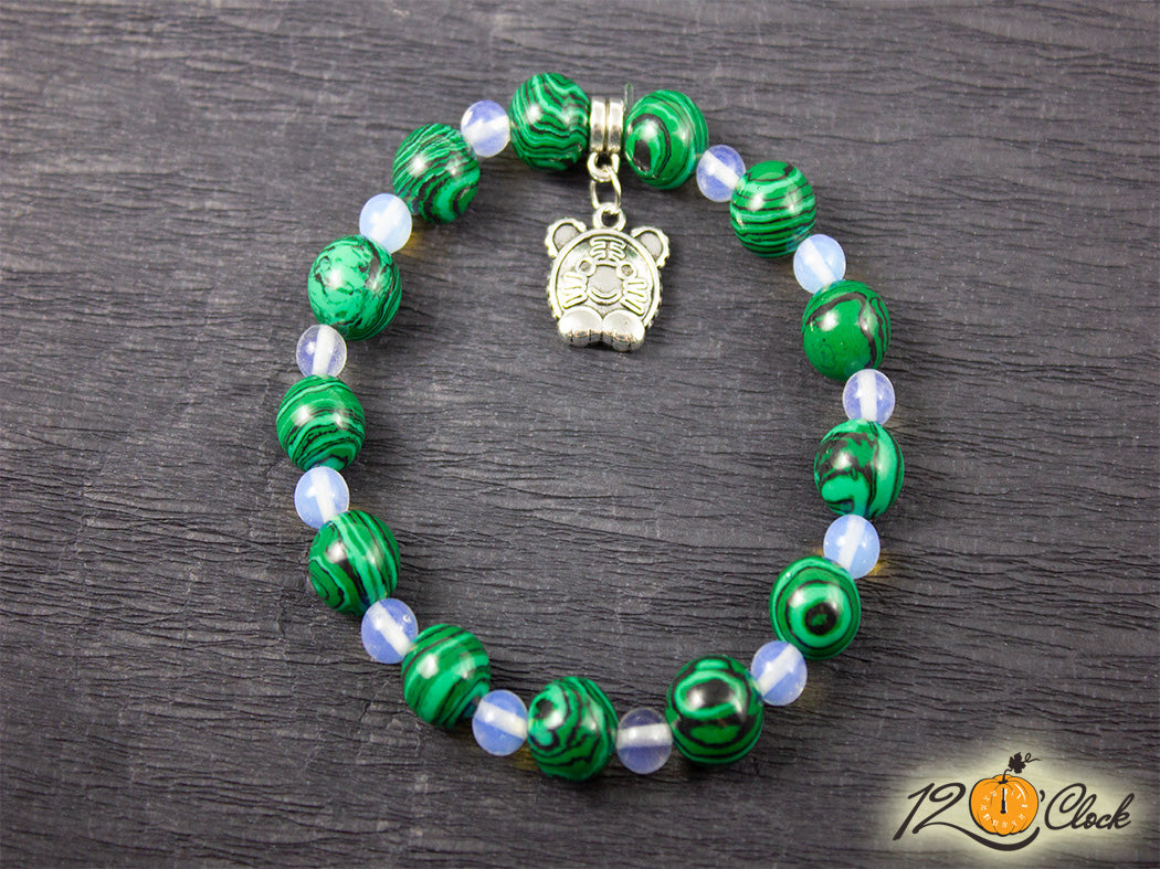 Ръчно изработена гривна с еластична корда, разделител, халка, символ на тигър и съчетание от камъни малахит 10мм и лунен камък 6мм.