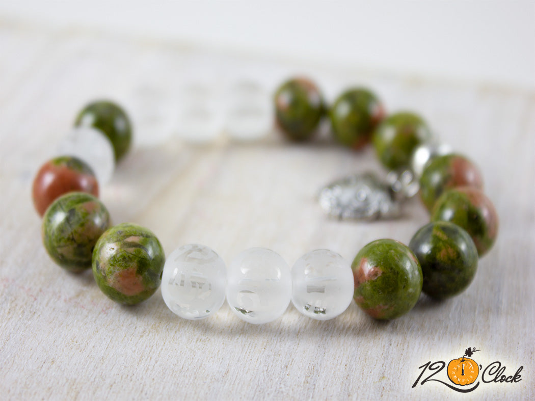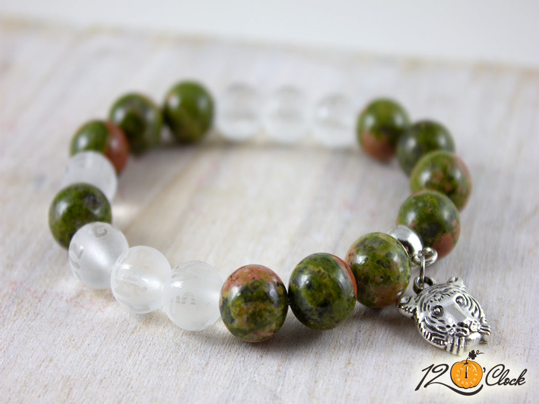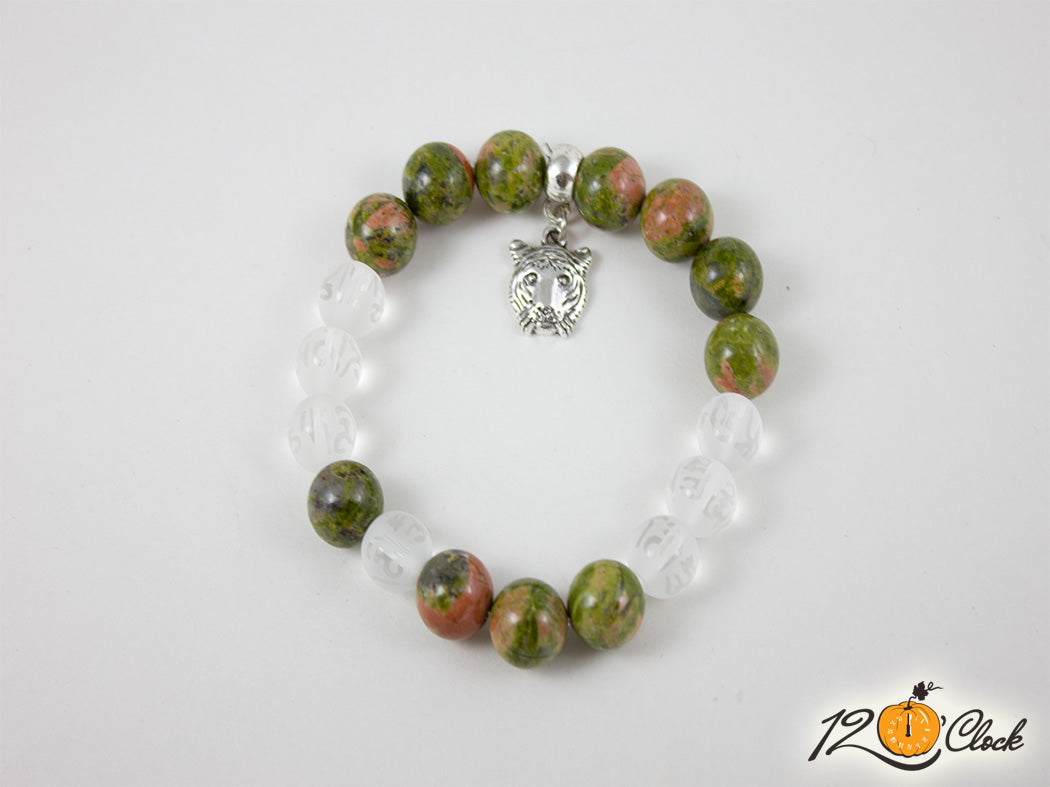 Ръчно изработена гривна с еластична корда, разделител, халка, символ на тигър и съчетание от камъни унакит 10мм и планински кристал мат с йероглифи 6мм.