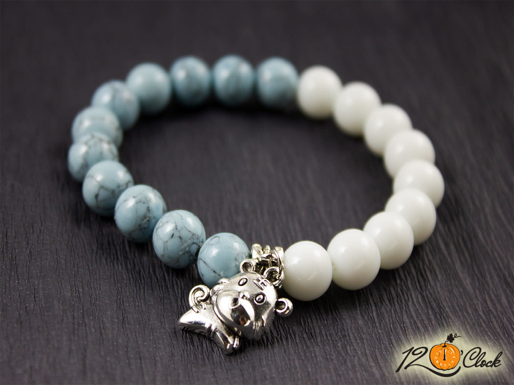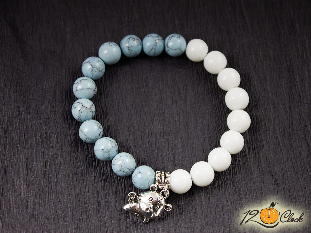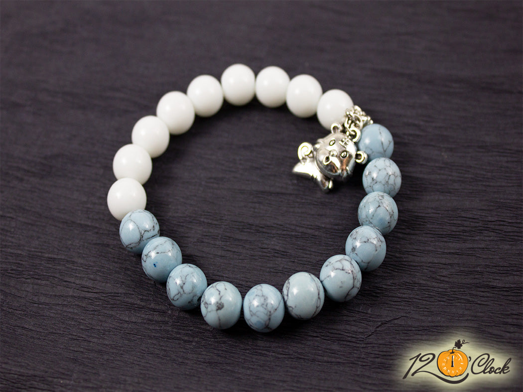 Ръчно изработена гривна с еластична корда, разделител, халка, символ на тигър и камъни в съчетание от син хаулит 10мм и бял ахат 10мм.