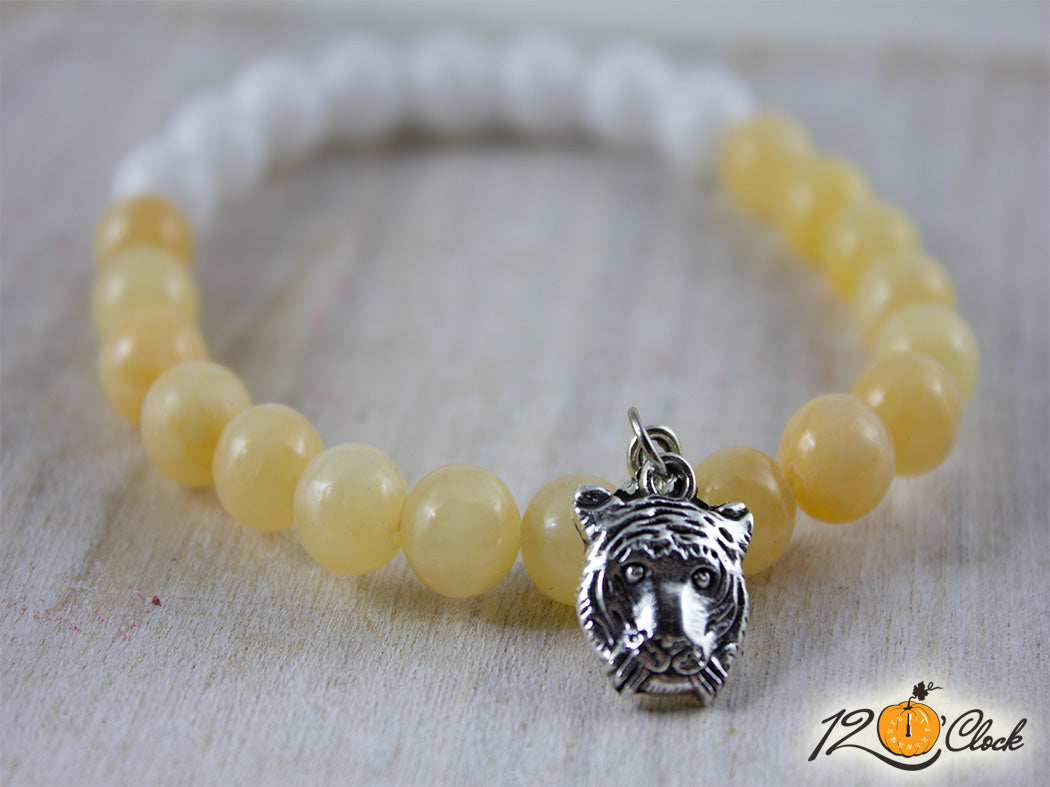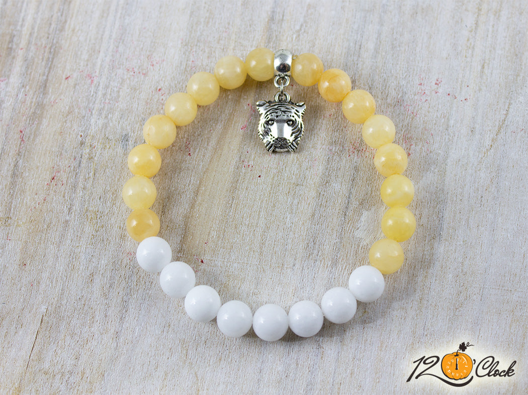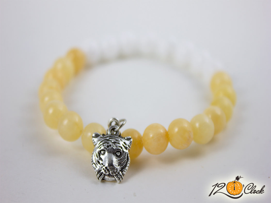Ръчно изработена гривна с еластична корда, разделител, халка, символ на тигър и в съчетание с камъни от жълт жадеит 8мм и бял кварц 8мм.