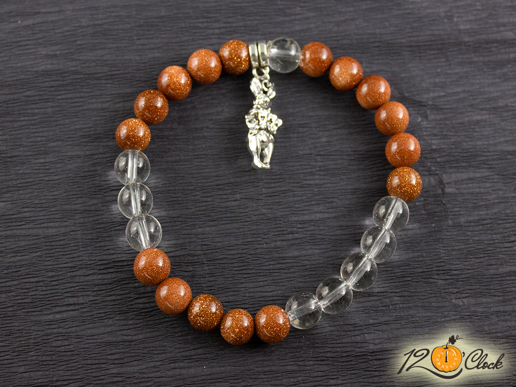 Ръчно изработена гривна с еластична корда, разделител, халка, символ на заек и камъни от кафяв слънчев камък 8 мм и планински кристал 8 мм