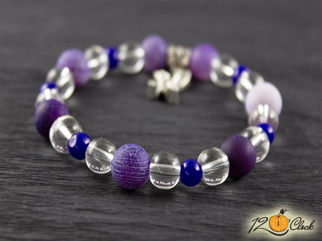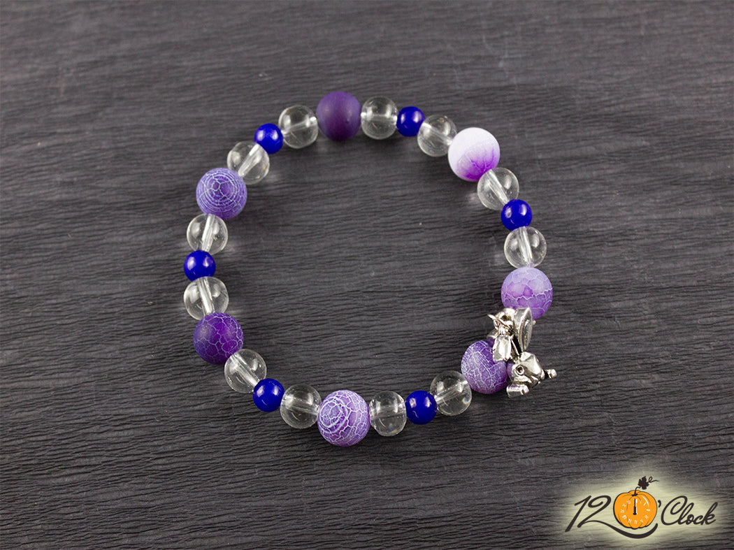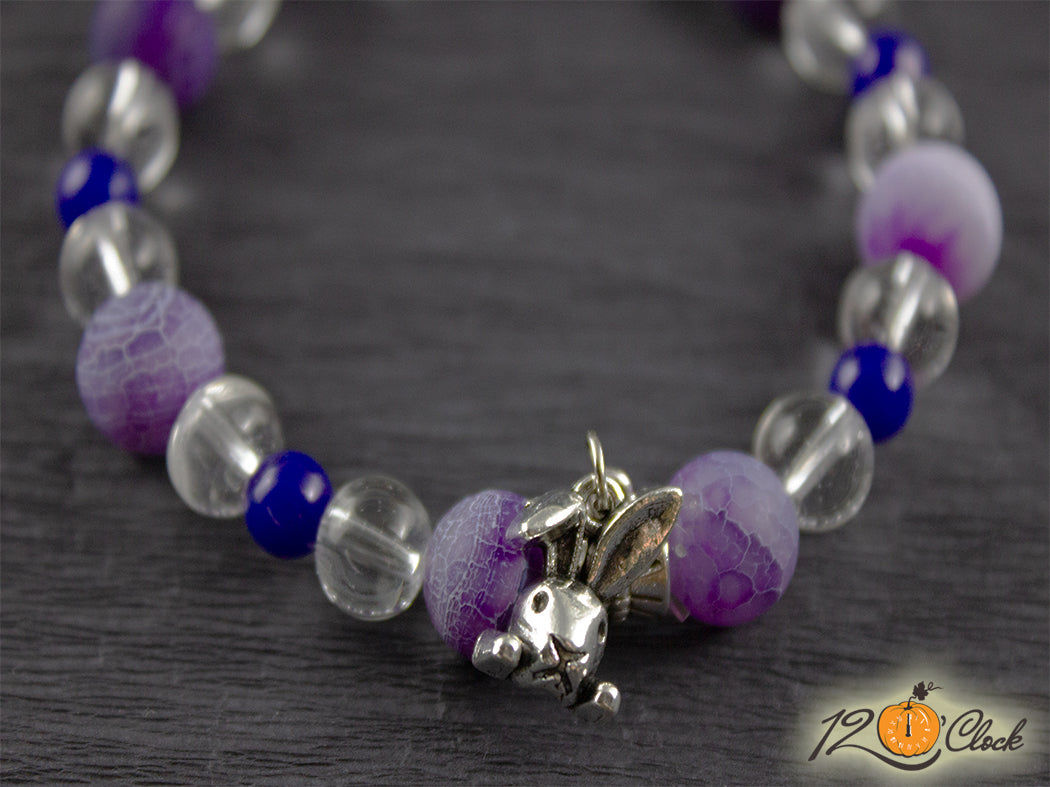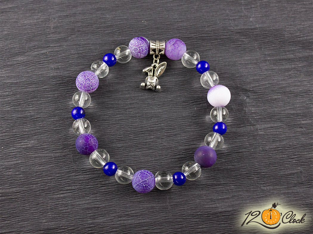 Ръчно изработена гривна с еластична корда, разделител, халка, символ на заек и камъни в комбинация от лилав драконов ахат мат 10 мм, планински кристал 8 мм и тъмно син ахат 6 мм.