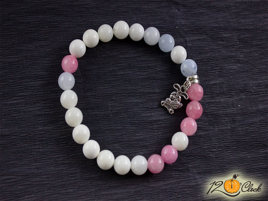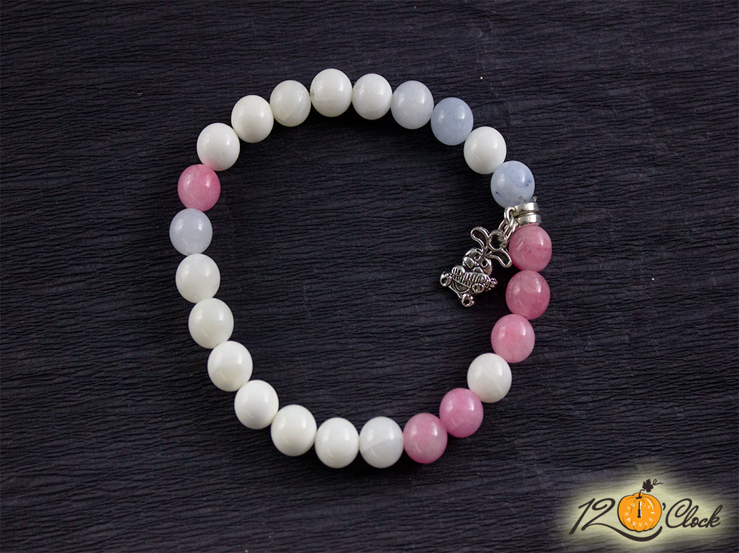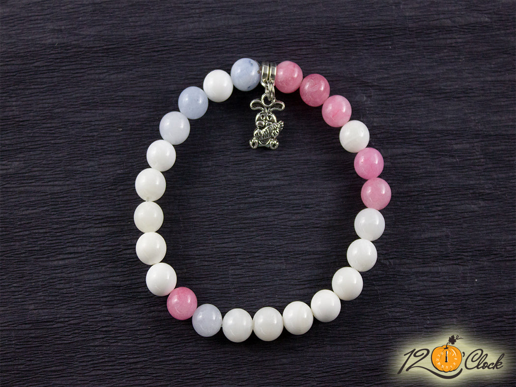 Ръчно изработена гривна с еластична корда, разделител, халка, символ на заек и камъни от ягодов кварц 8 мм, седеф 8 мм и берил 8 мм