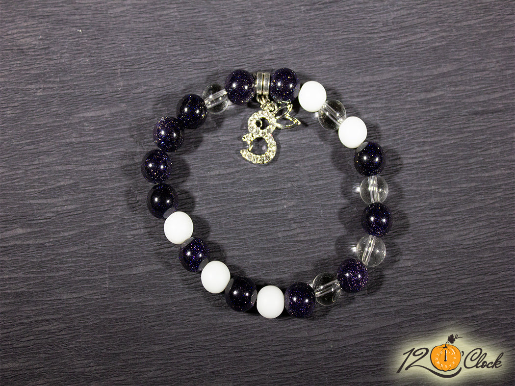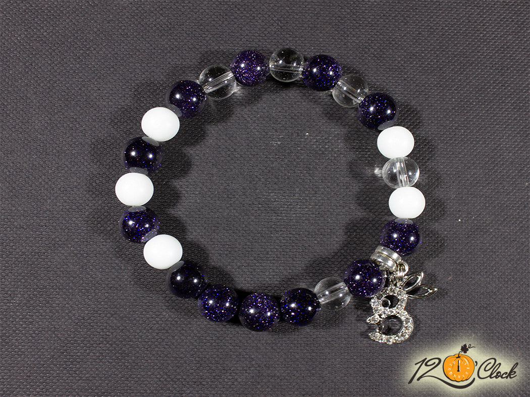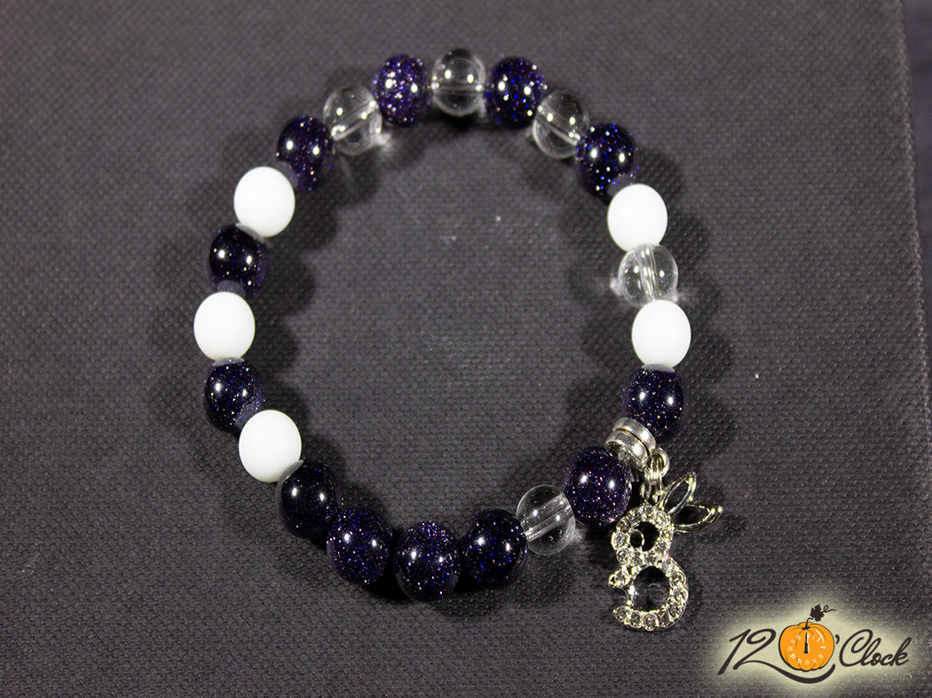 Ръчно изработена гривна с еластична корда, разделител, халка, символ на заек и камъни от син слънчев камък 8 мм, бялахат мат 8 мм и планински кристал 8 мм