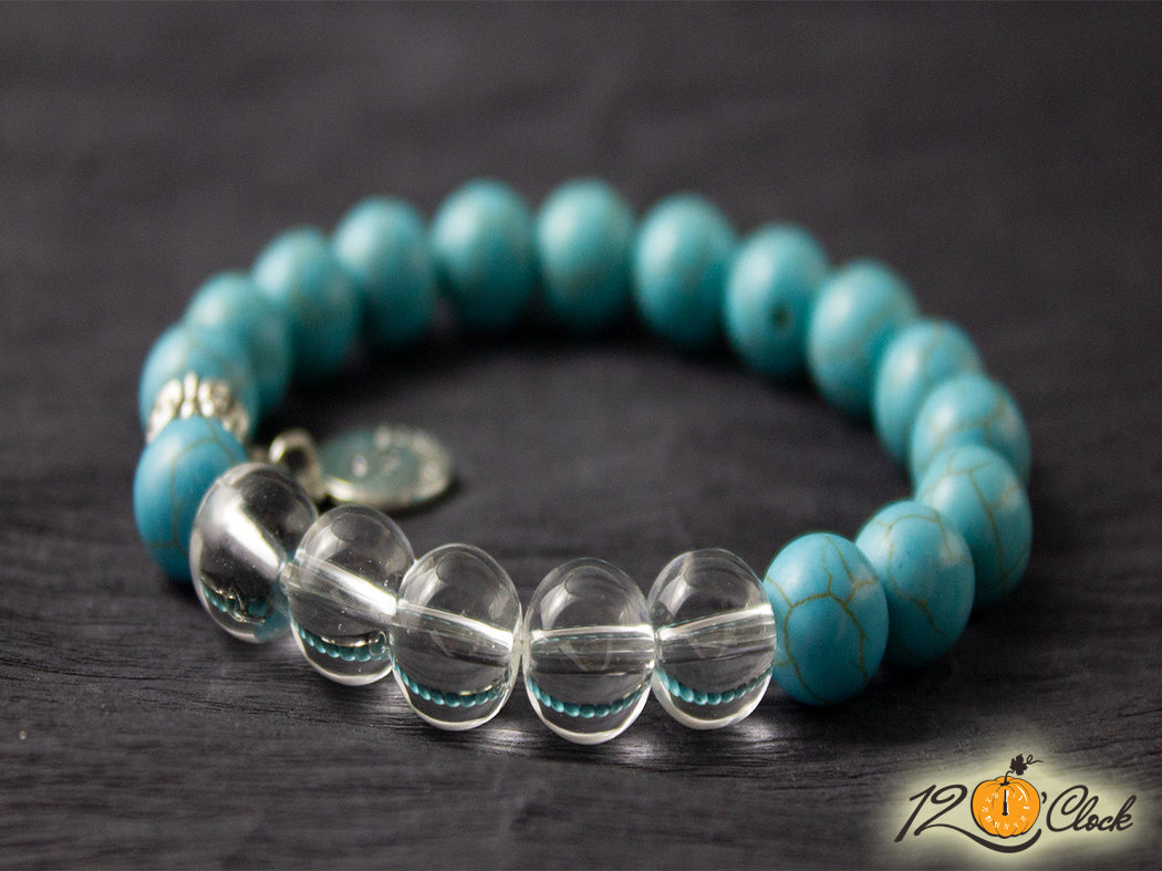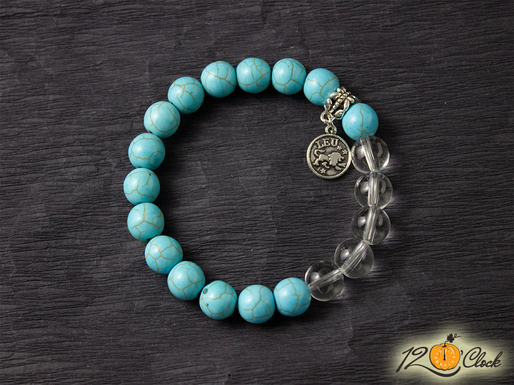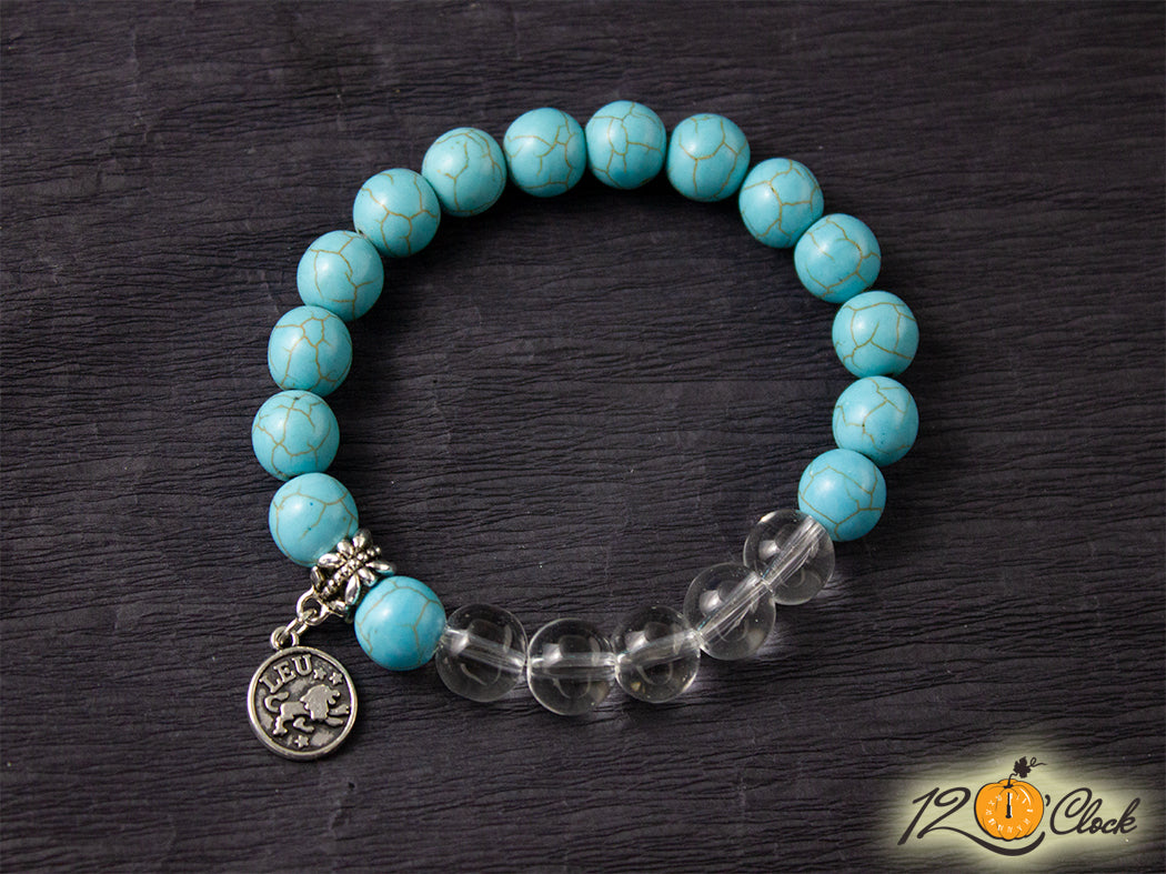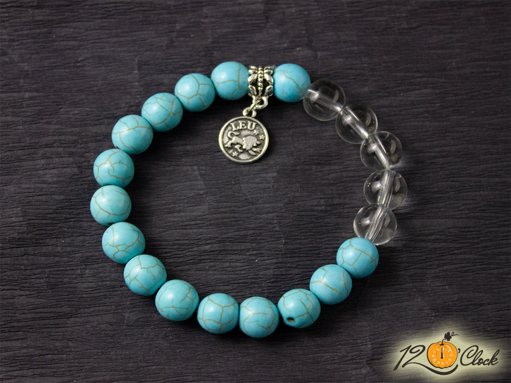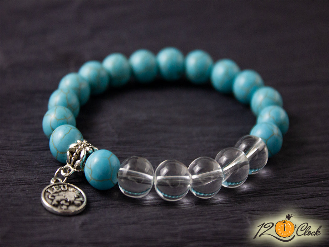 Ръчно изработена гривна от еластична корда, зодия и камъни в комбинация от тюркоаз 10мм и планински кристал 10мм