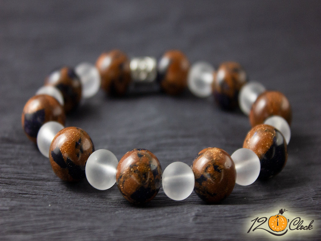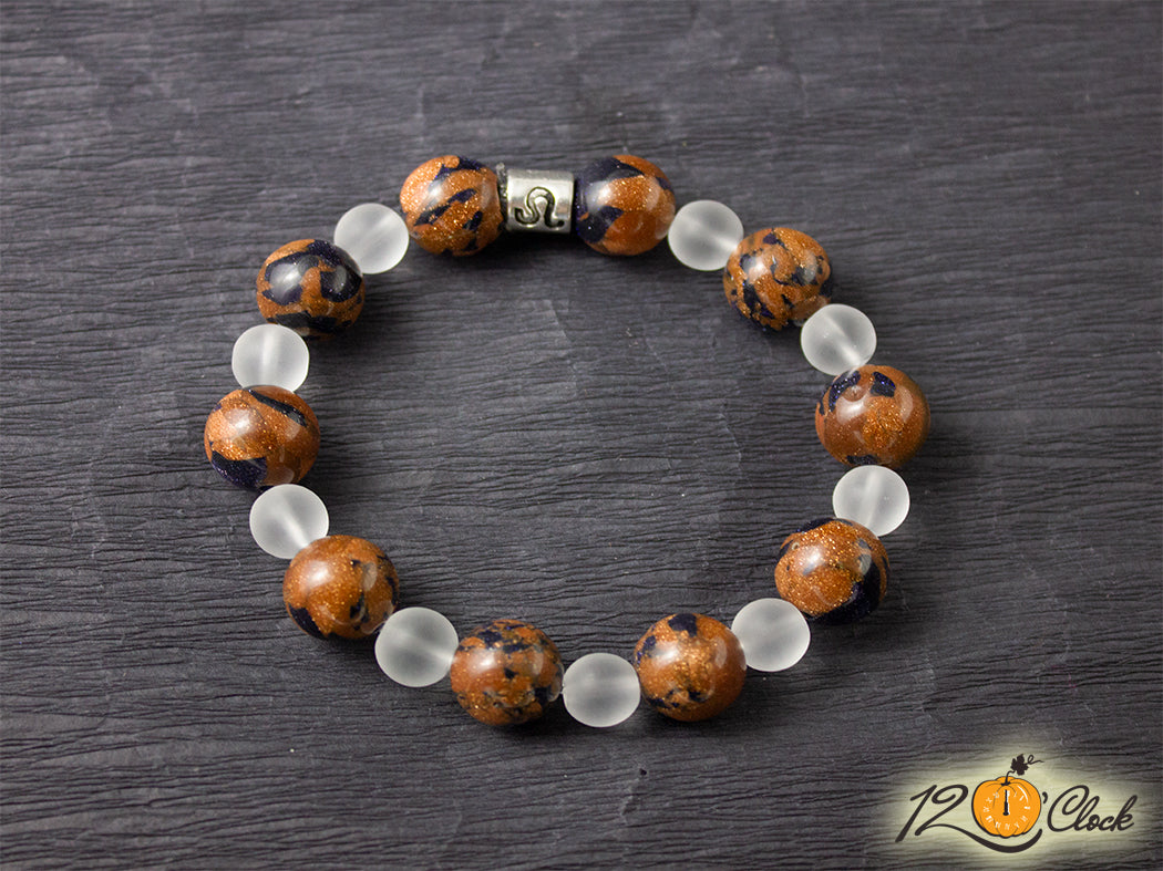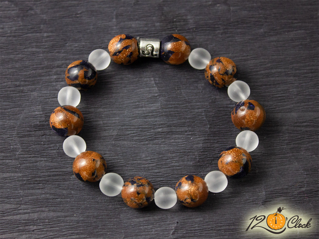 Ръчно изработена гривна от еластична корда, зодия и камъни в комбинация от слънчев камък 12мм и планински кристал мат 8мм