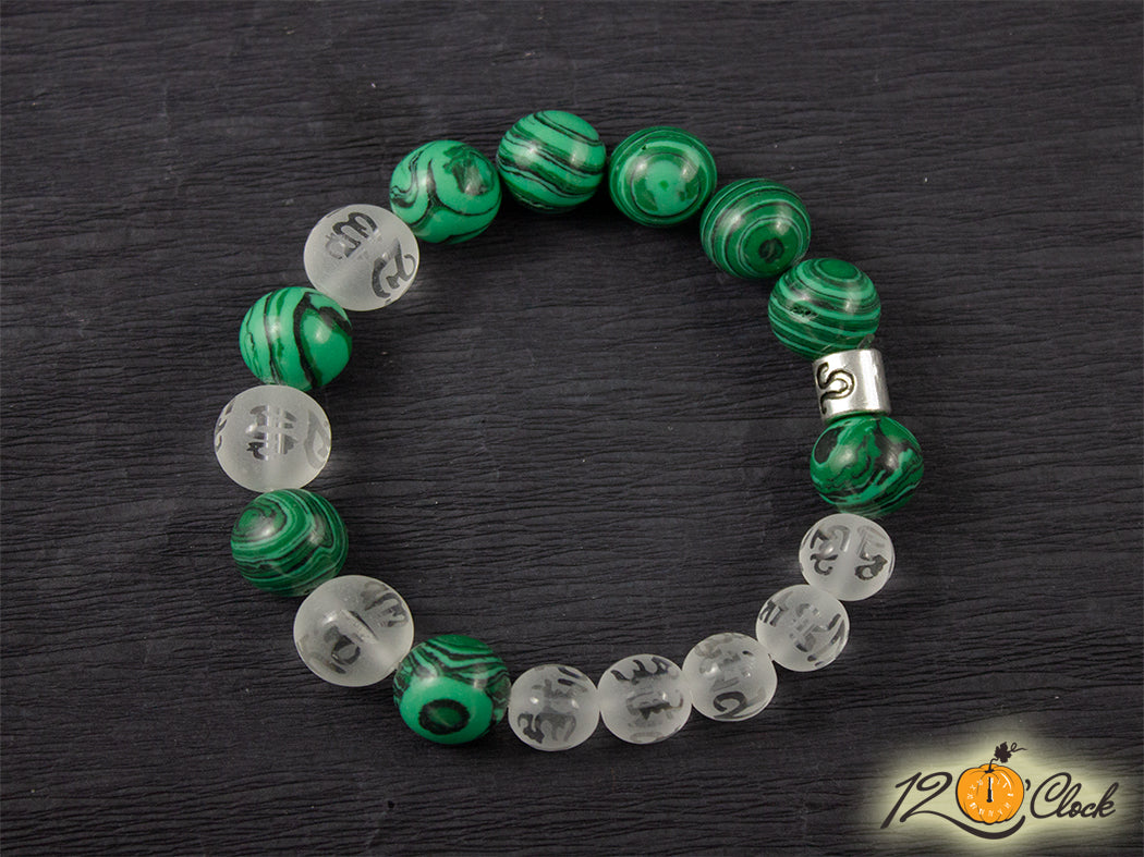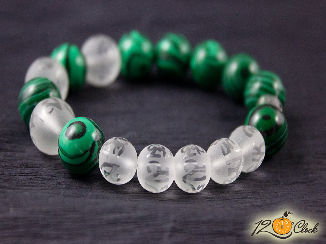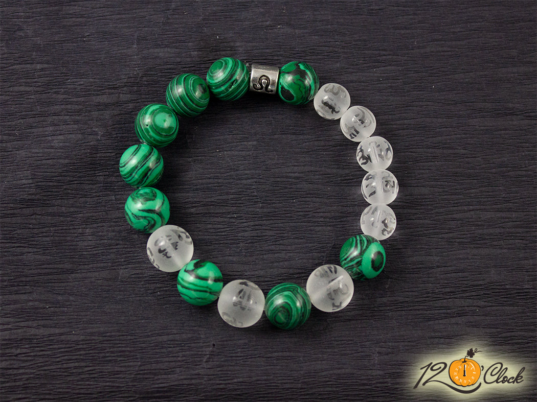 Ръчно изработена гривна от еластична корда, зодия и камъни в комбинация от малахит 12мм, планински кристал мат с надписи 12мм и 10мм