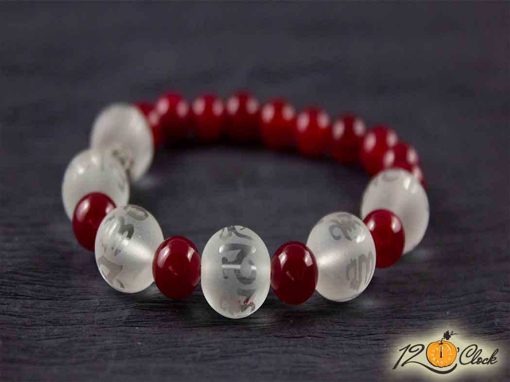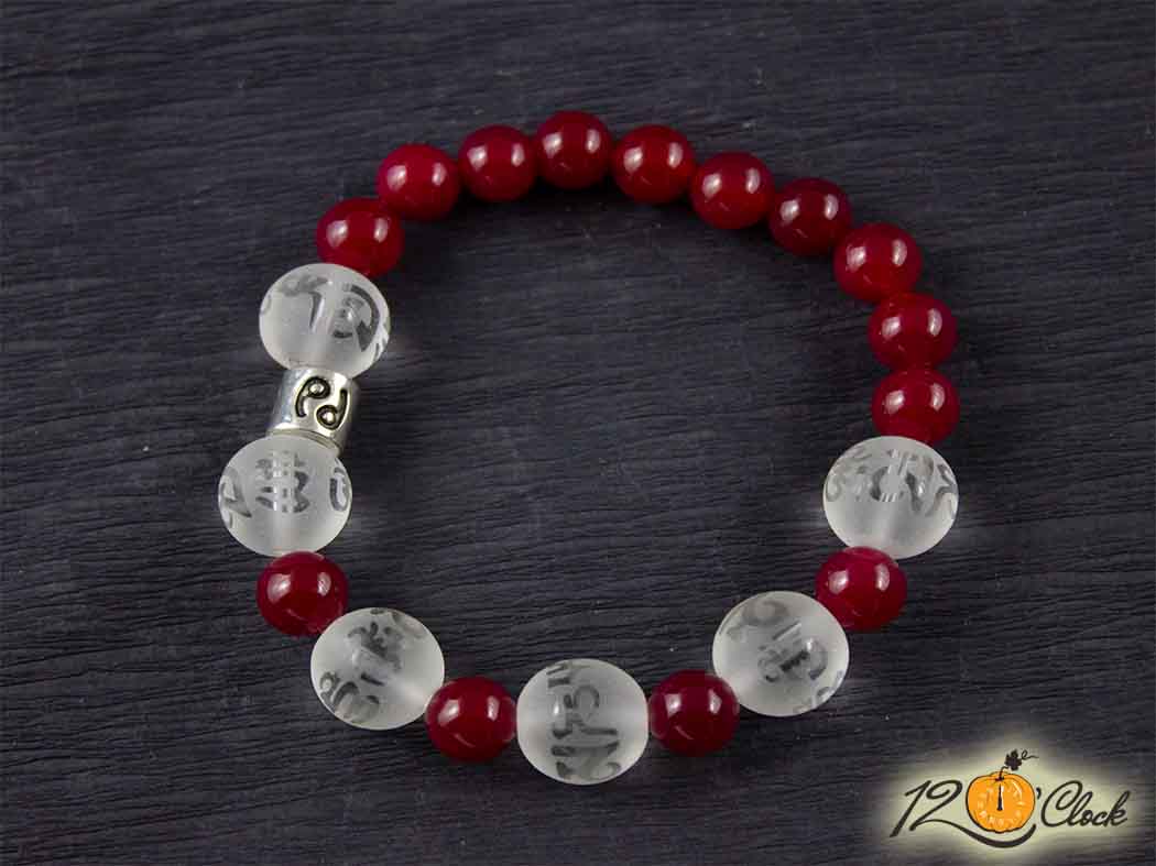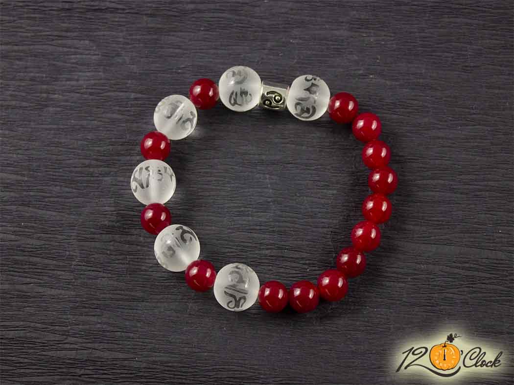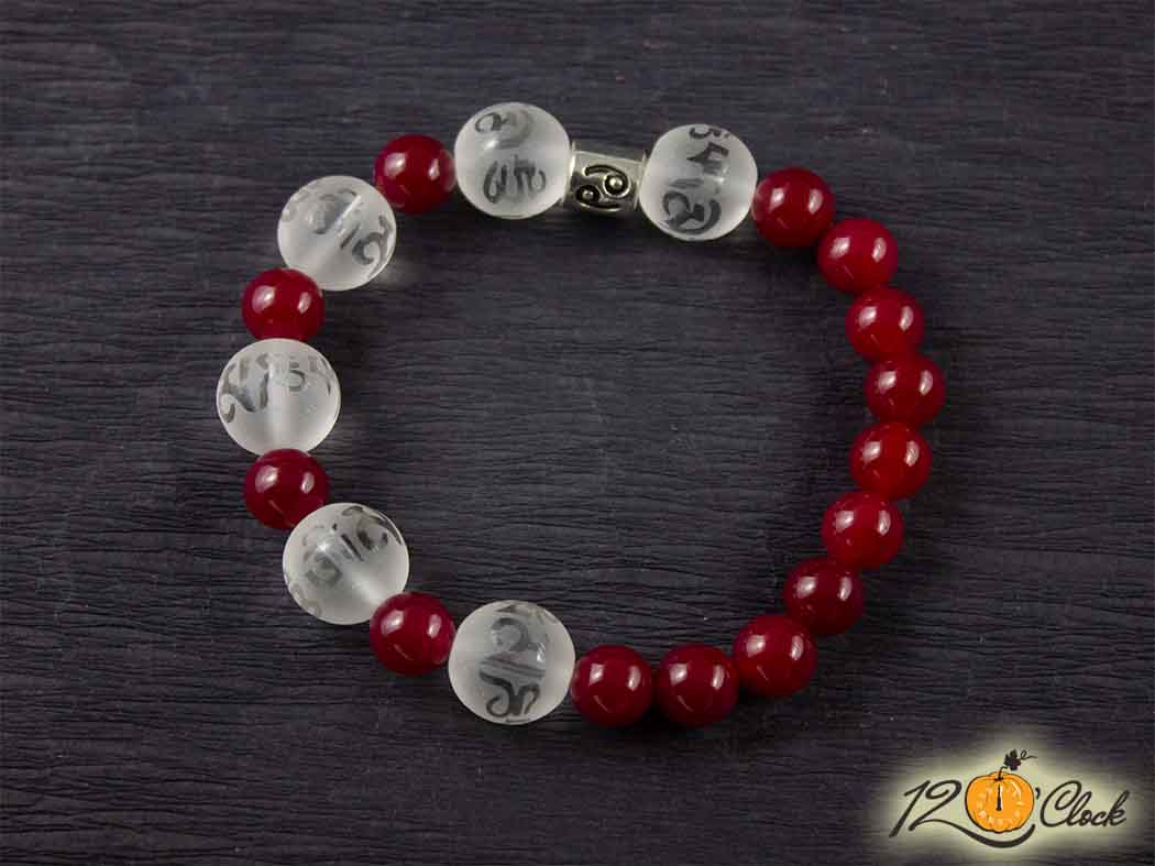 Ръчно изработена гривна с еластична корда, зодия и камъни в комбинация от планински кристал мат с надписи 12мм и червен ахат 8мм
