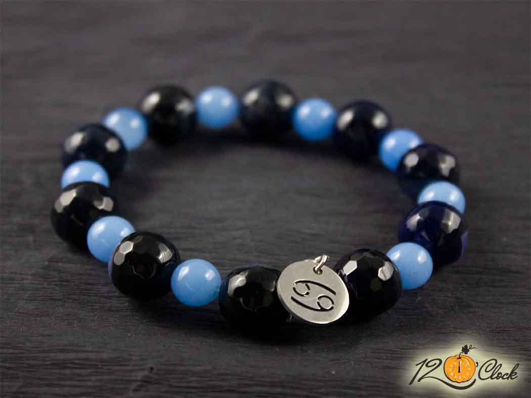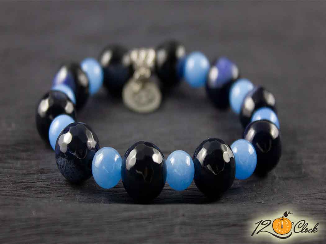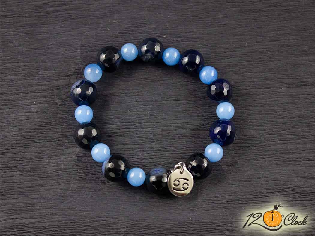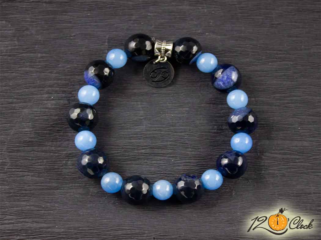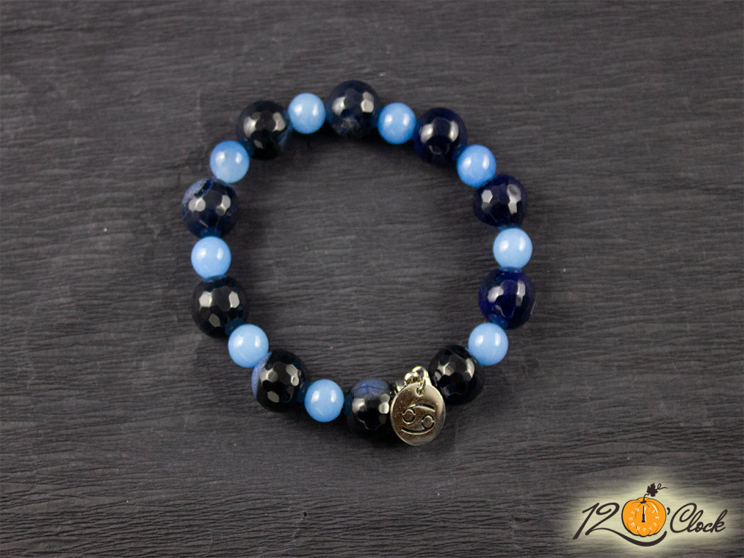 Ръчно изработена гривна от еластична корда, халка и зодия, и камъни в комбинация от тъмно син фасетиран ахат 12мм и светло син фасетиран ахат 8мм