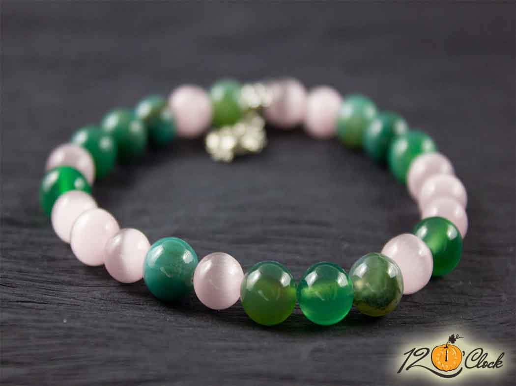Ръчно изработена гривна от еластична корда, халка и зодия и камъни в комбинация от зелен ивчест ахат 8мм и светло розово котешко око 8мм