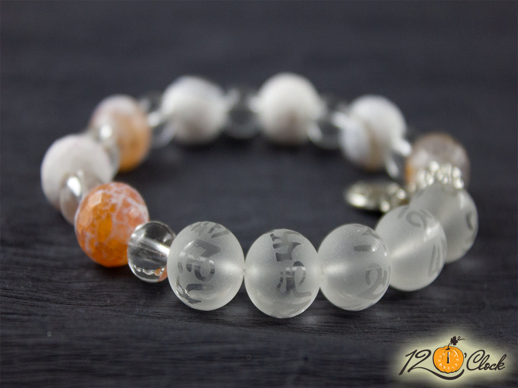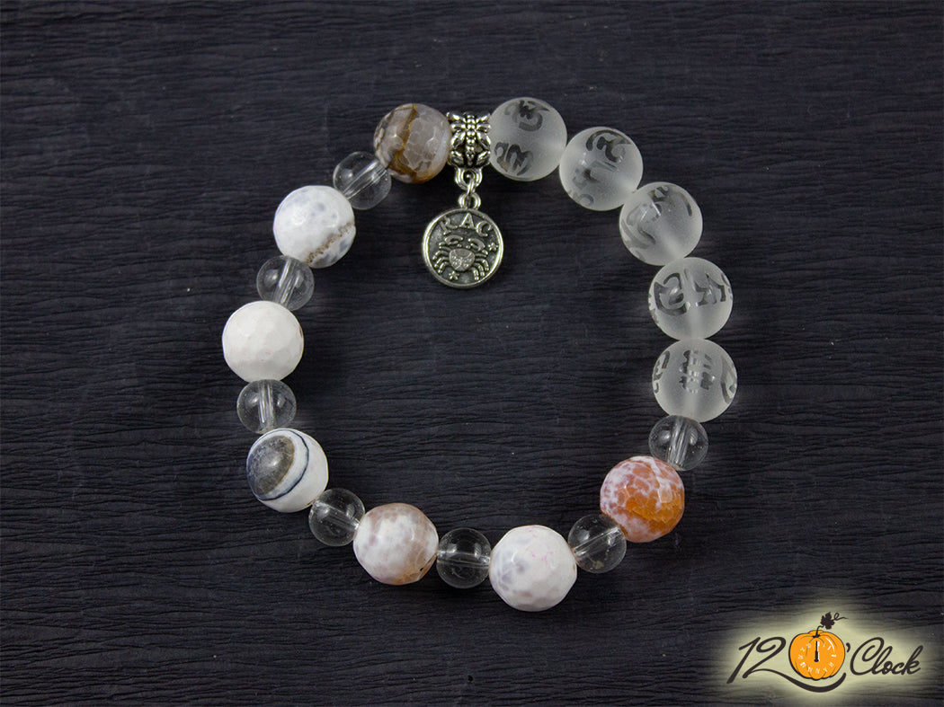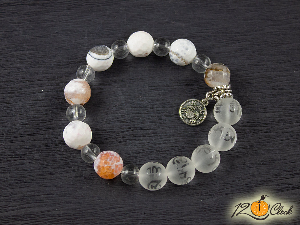 Ръчно изработена гривна от еластична корда, халка и зодия и камъни в комбинация фасетиран драконов ахат 12мм, планински кристал мат с надписи 12мм и планински кристал 8мм