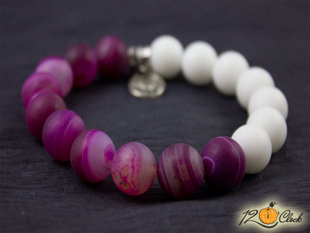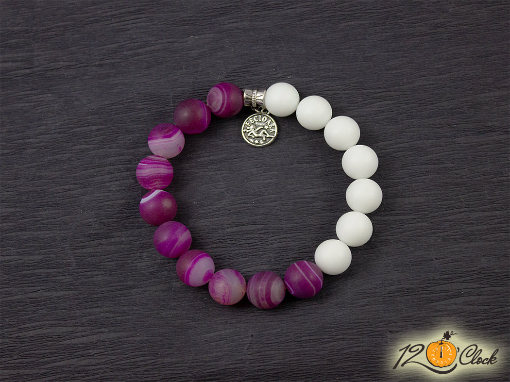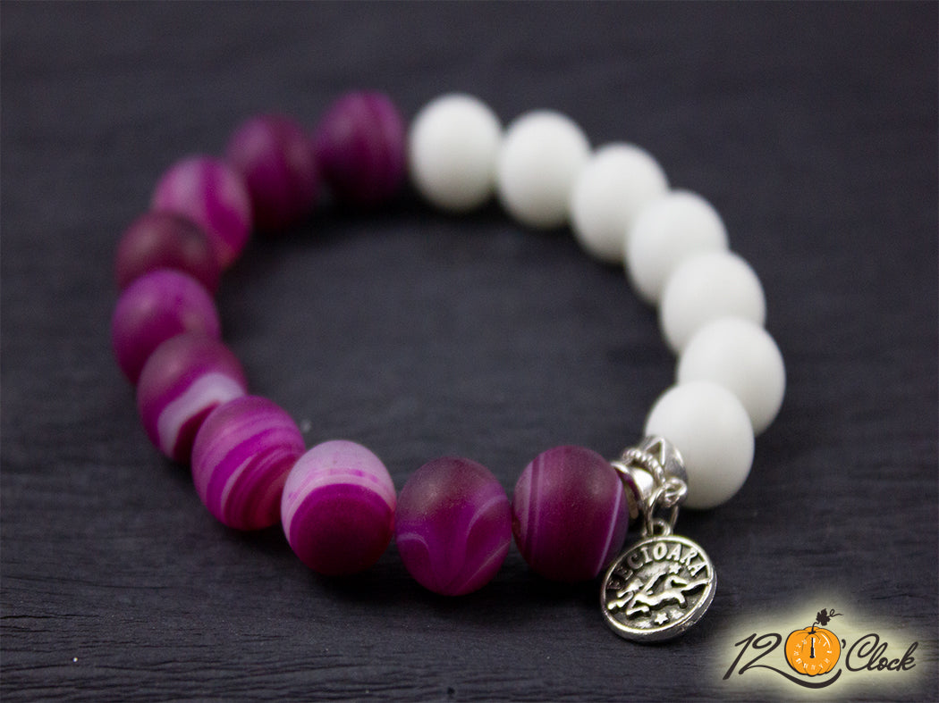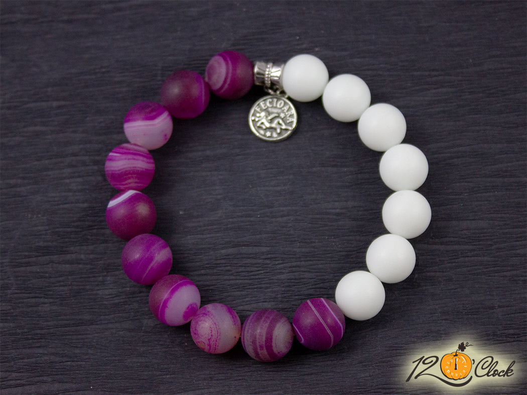 Ръчно изработена гривна с основа еластична корда, зодия и камъни от розов ивчест ахат мат 12мм и бял ахат мат 12мм