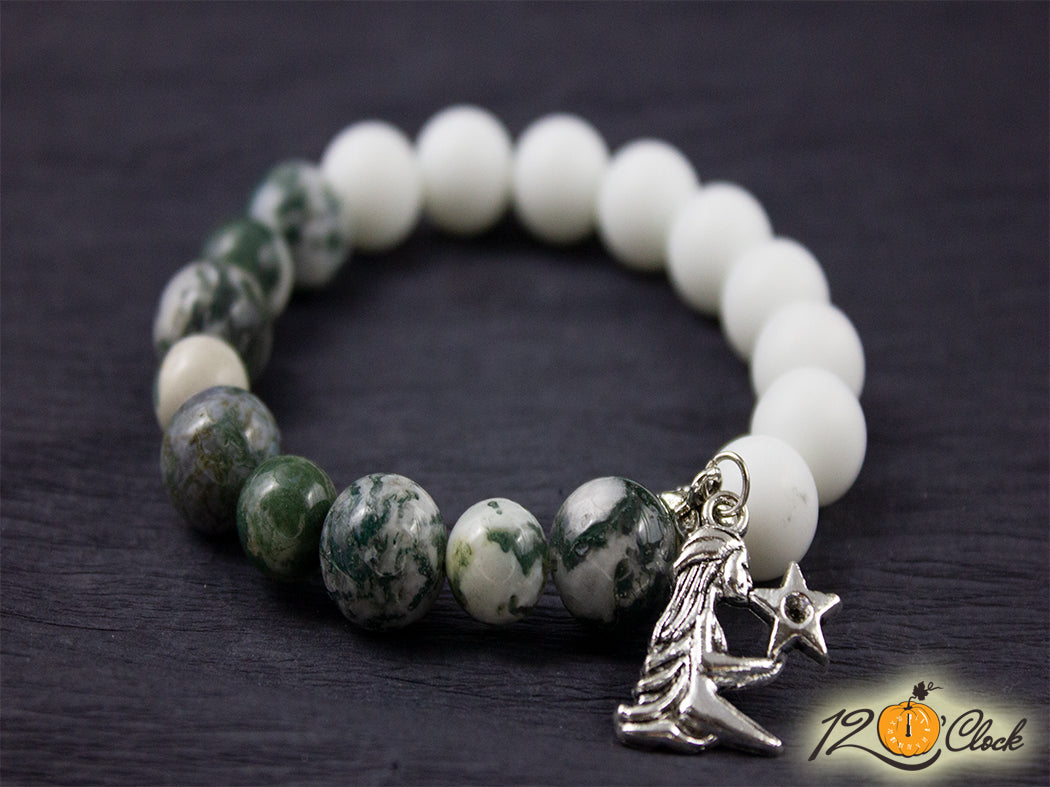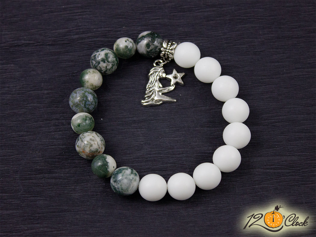 Ръчно изработена гривна с основа еластична корда, зодия и камъни от мъхов ахат 10мм и 12 мм и бял ахат мат 12мм