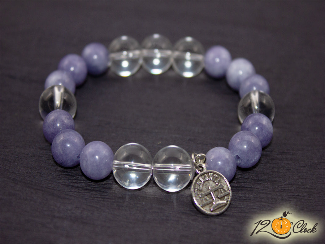 Ръчно изработена гривна с основа еластична корда, зодия и камъни от аквамарин 8мм и планински кристал 8мм