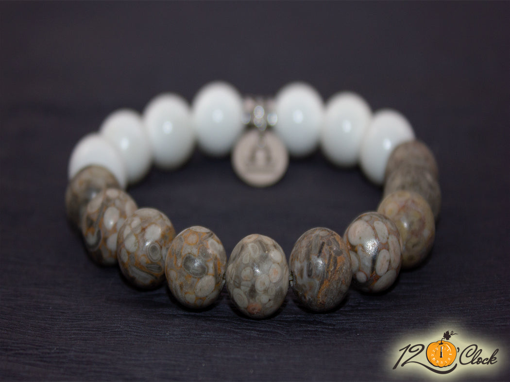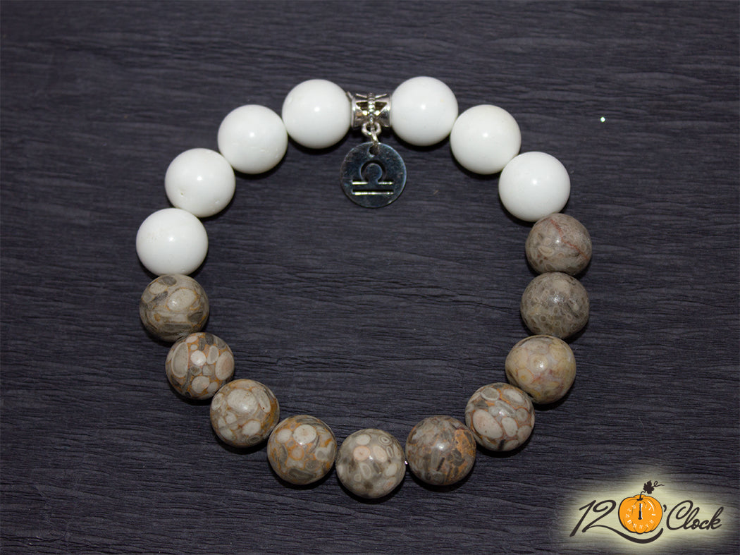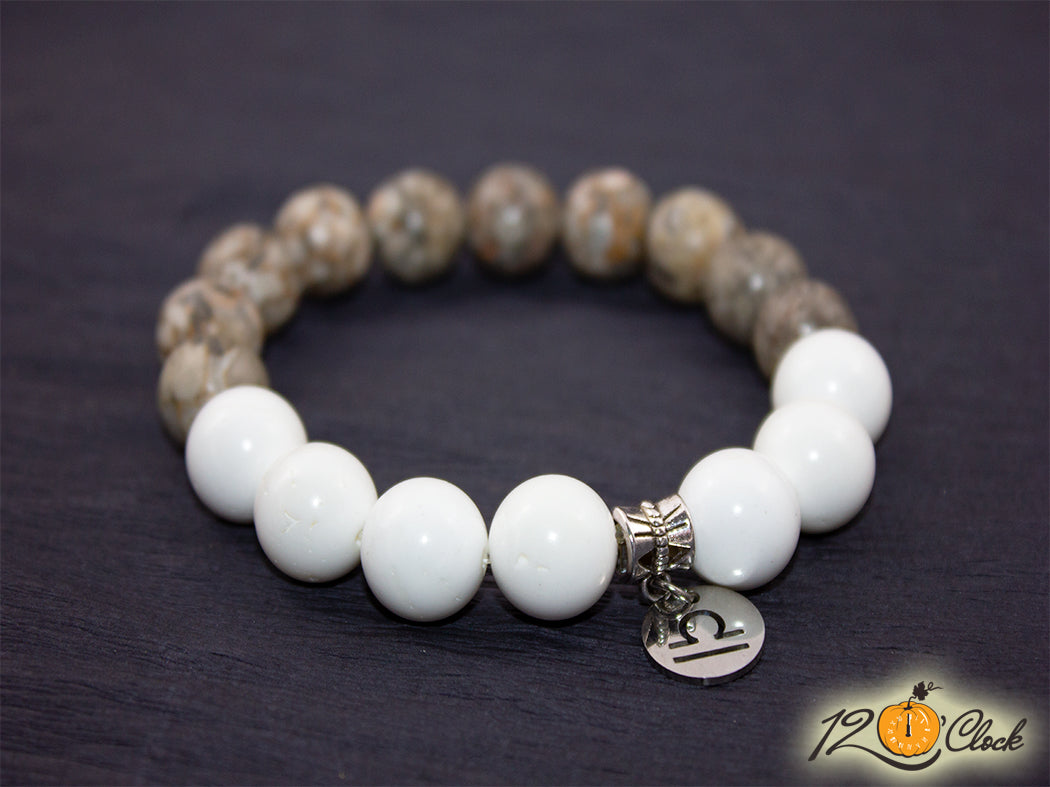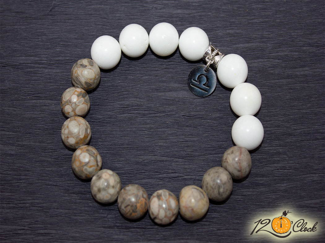 Ръчно изработена гривна с основа еластична корда, зодия и камъни от леопардов яспис 12мм и седеф 12мм