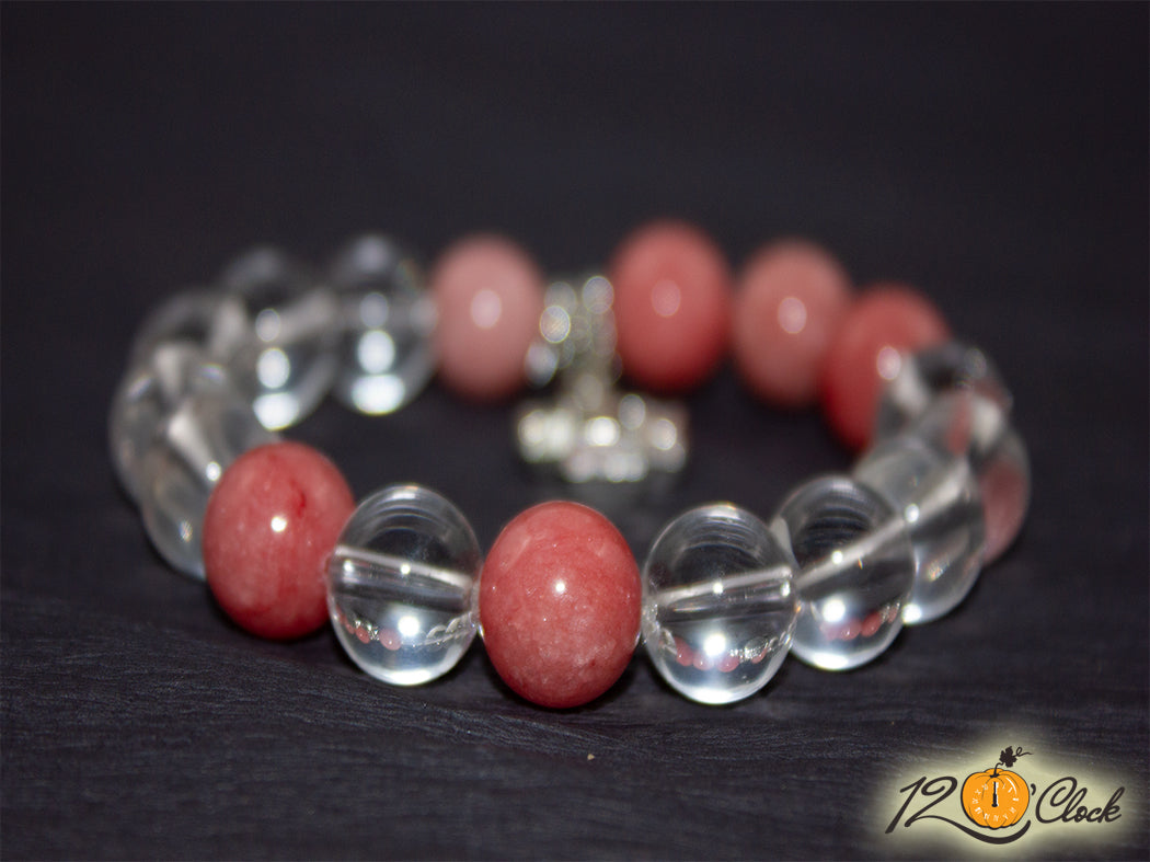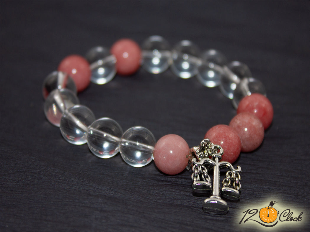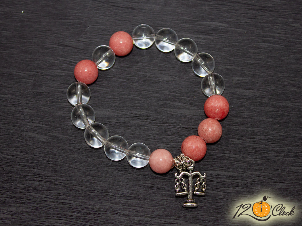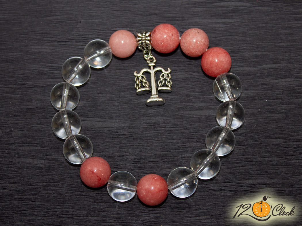 Ръчно изработена гривна с основа еластична корда, зодия и комбинация от камъни ягодов кварц 12мм и планински кристал 12мм