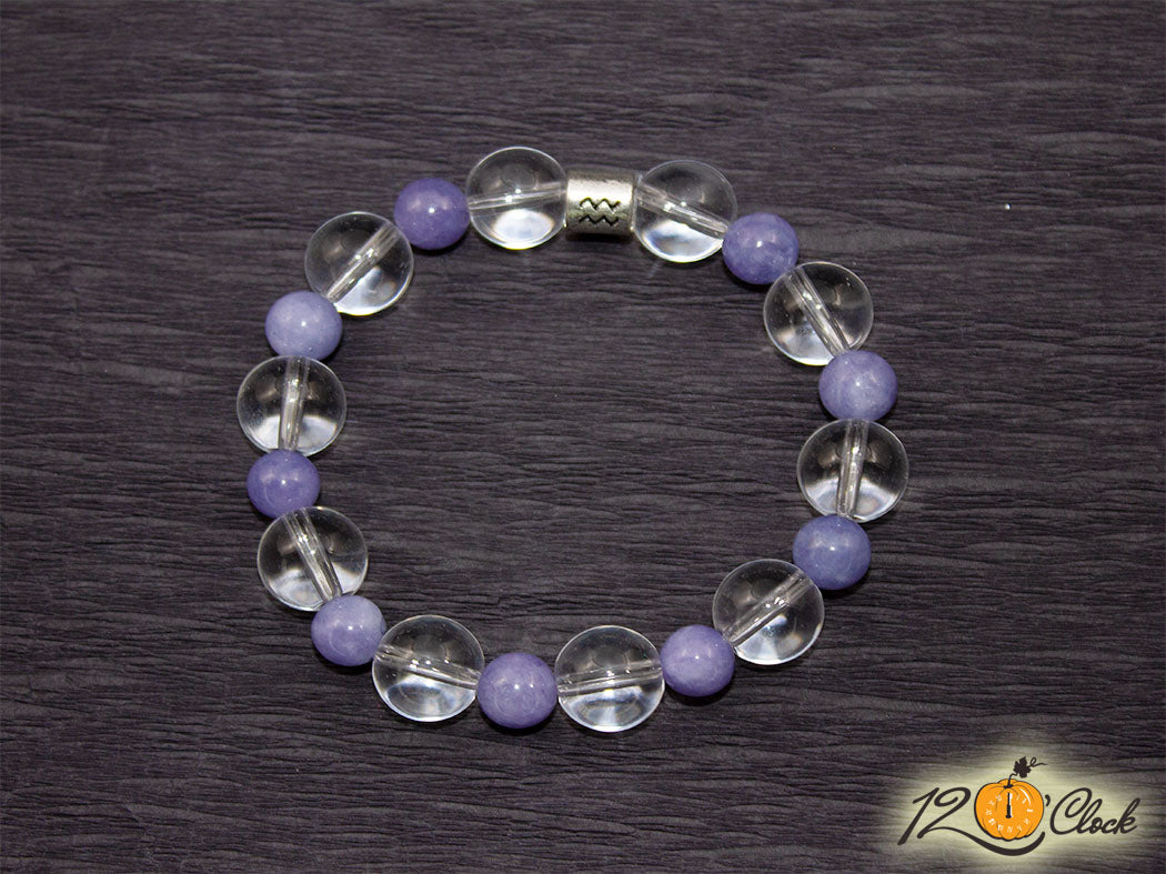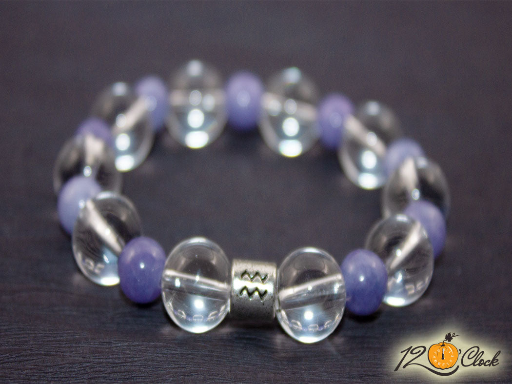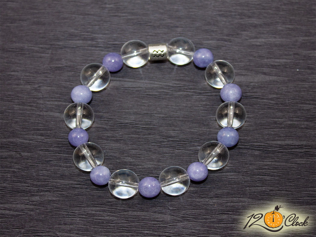 Ръчно изработена гривна с основа еластична корда, зодия и камъни в комбинация от аквамарин 8мм и планински кристал 12мм