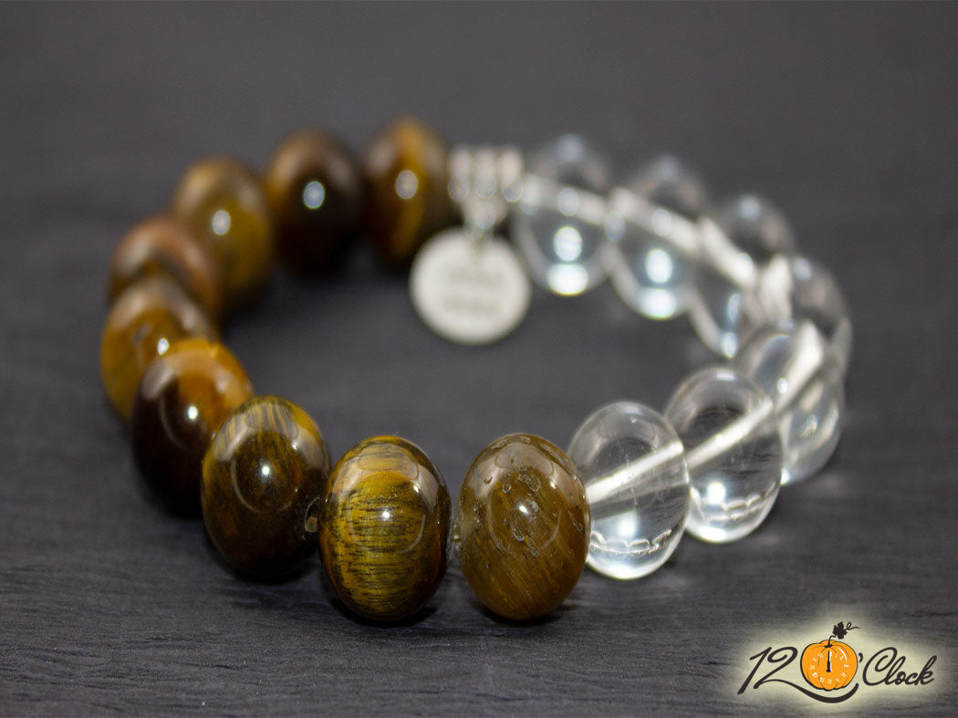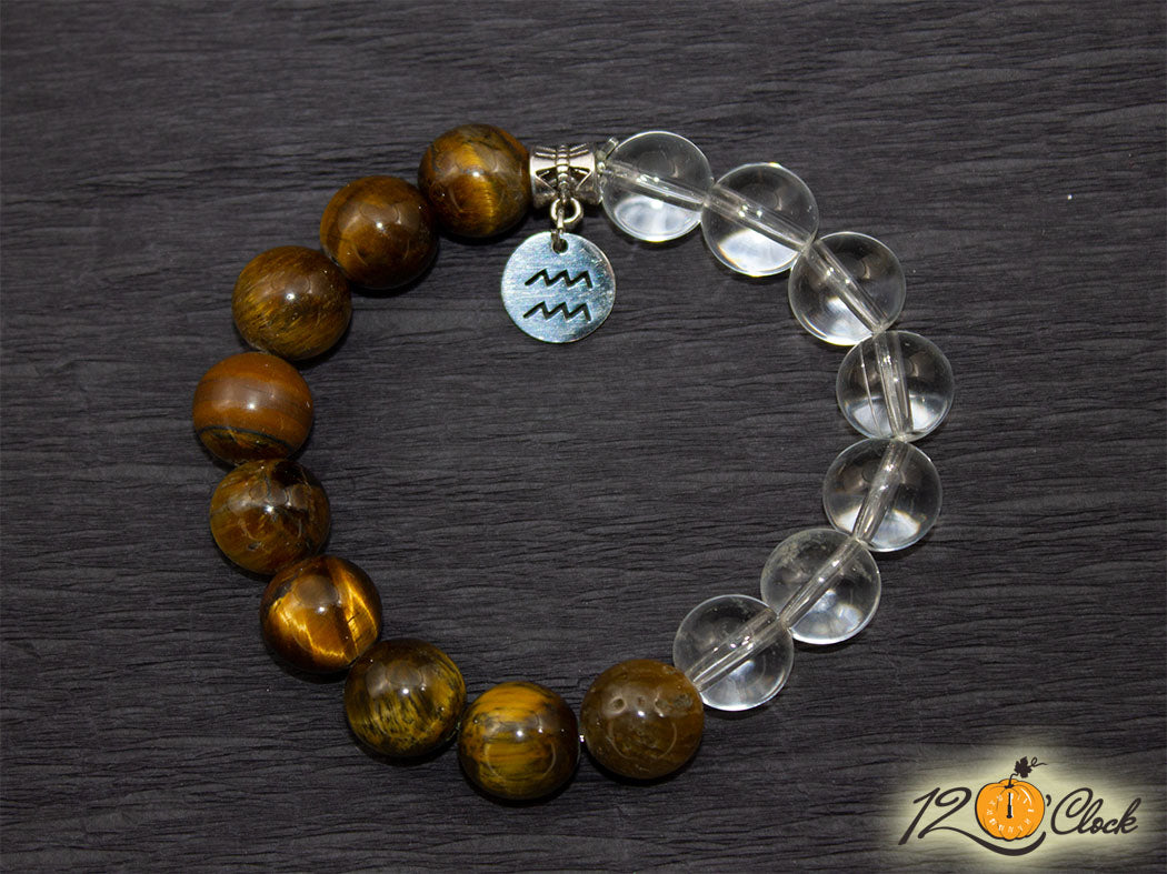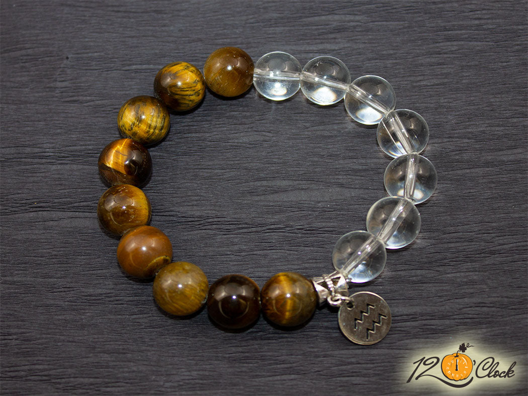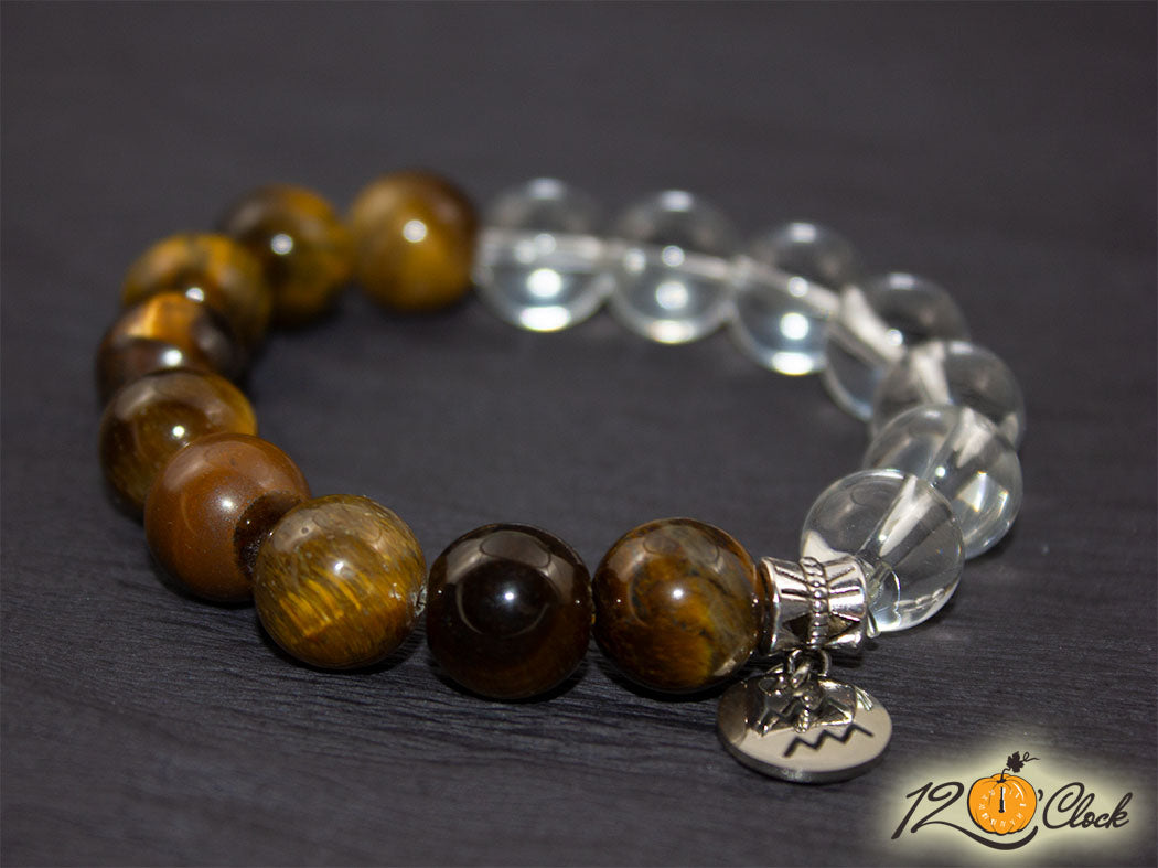 Ръчно изработена гривна с основа еластична корда, зодия и камъни в комбинация от тигрово око 12мм и планински кристал 12мм
