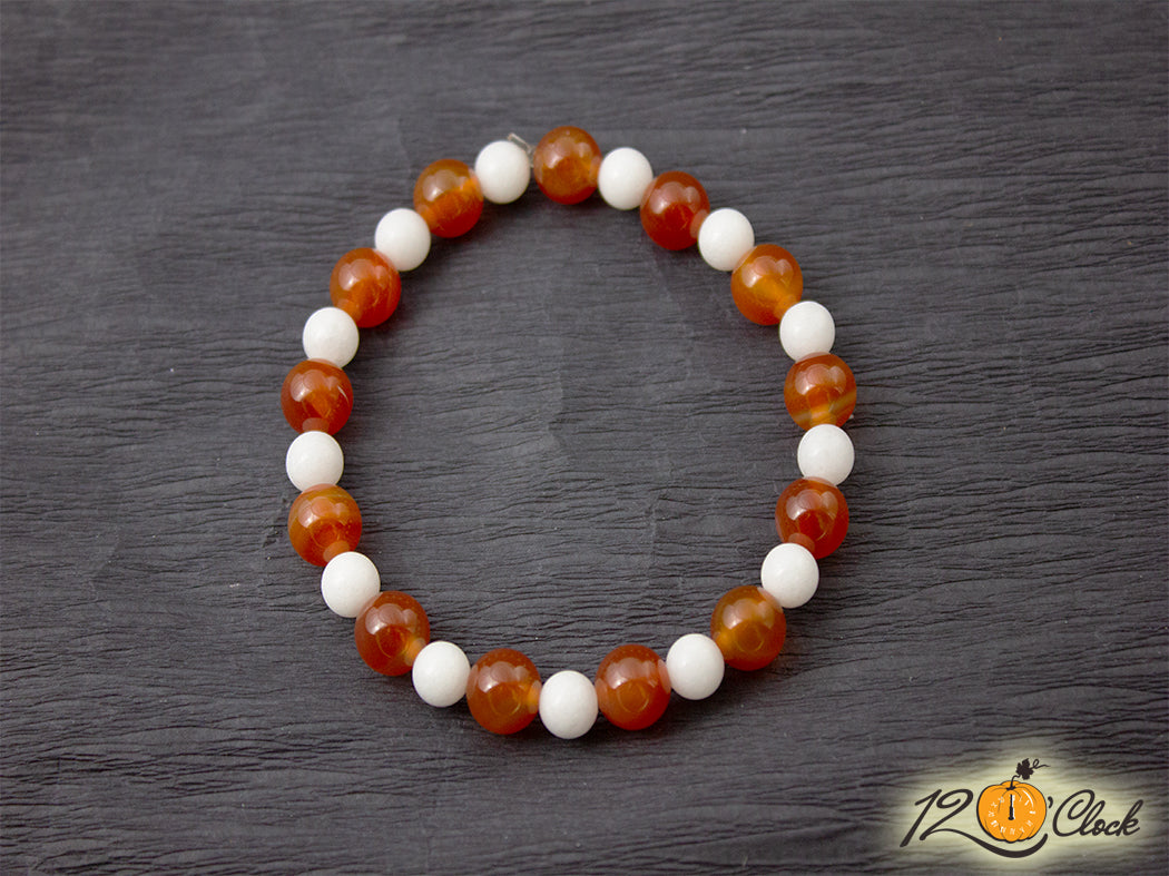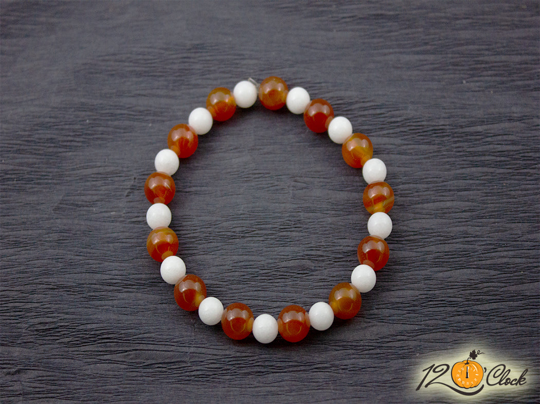 Ръчно изработена гривна с основа еластична корда, и камъни от оранжев ахат 8мм и бял кварц 6мм