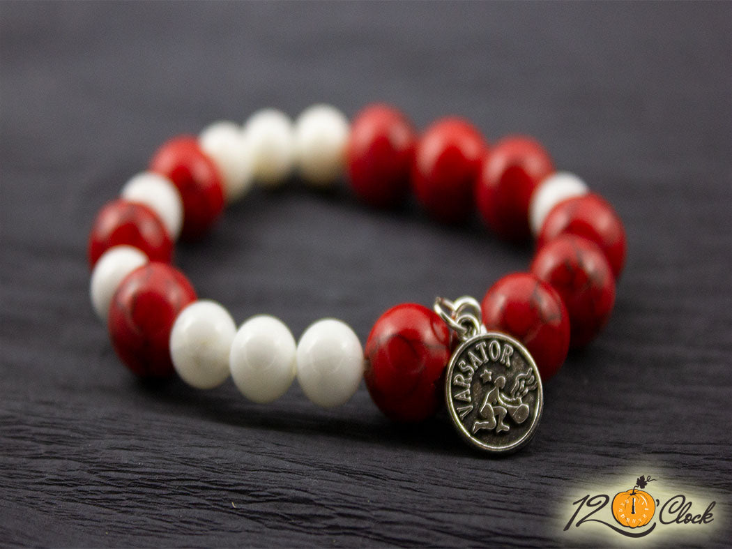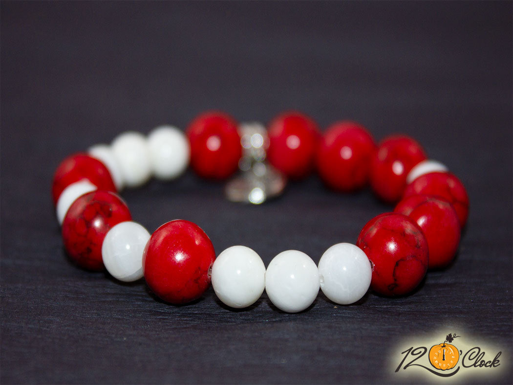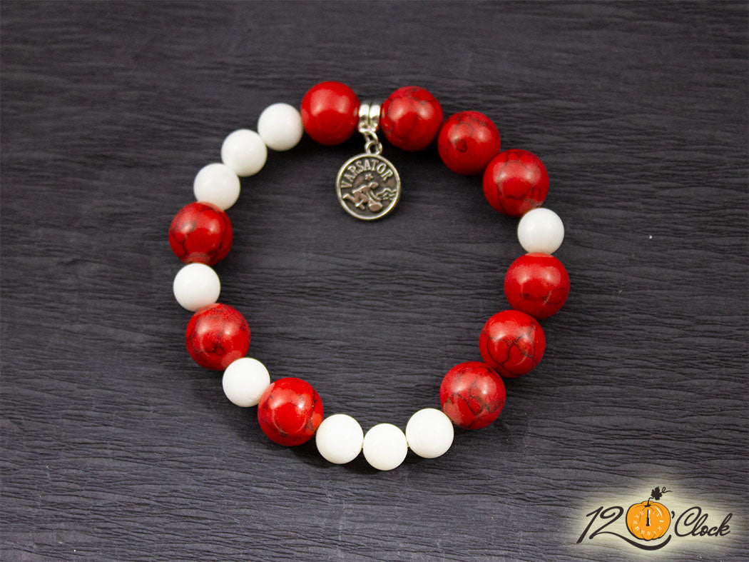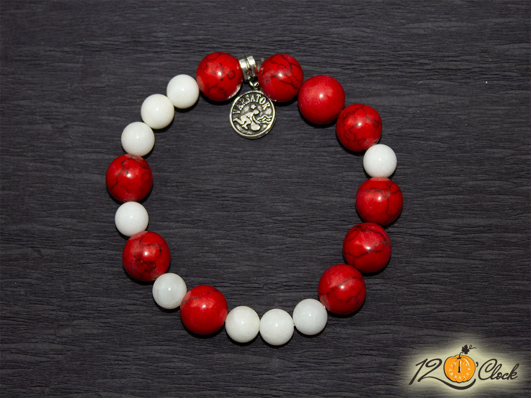 Ръчно изработена гривна с основа еластична корда, зодия и камъни в комбинация от червен тюркоаз 12мм и седеф 8мм