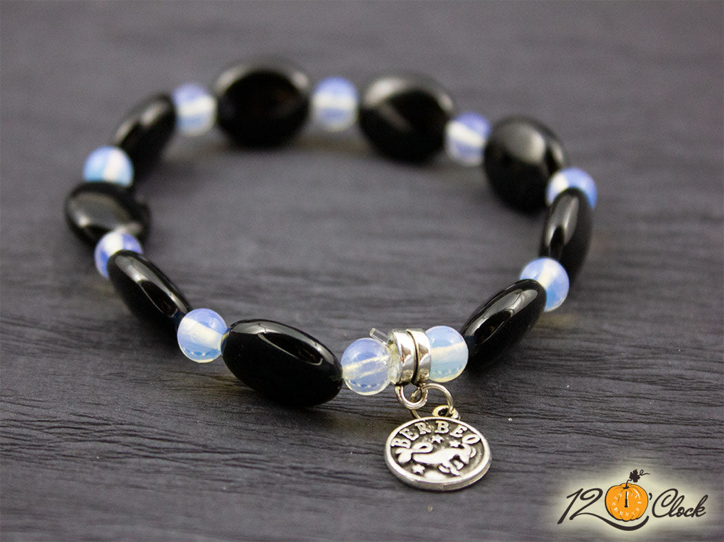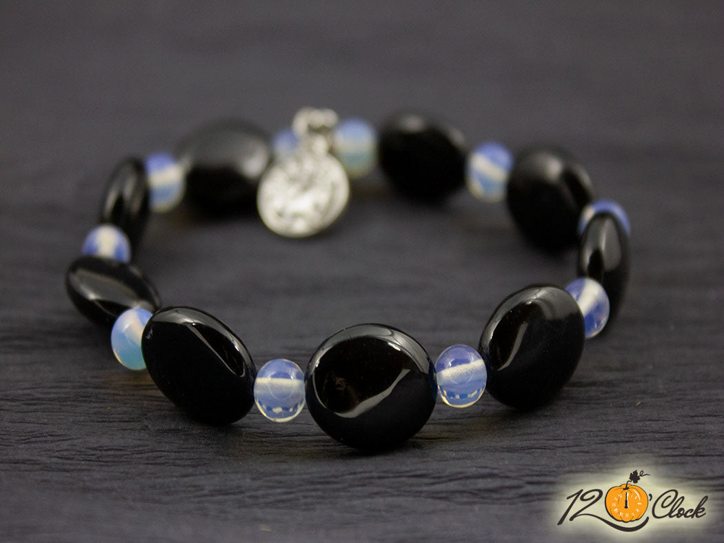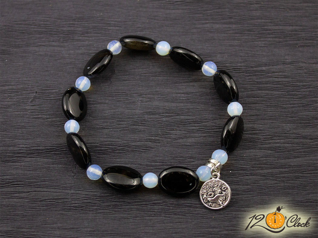 Ръчно изработена гривна с основа еластична корда, зодия и камъни в комбинация от овален оникс и лунен камък 6мм